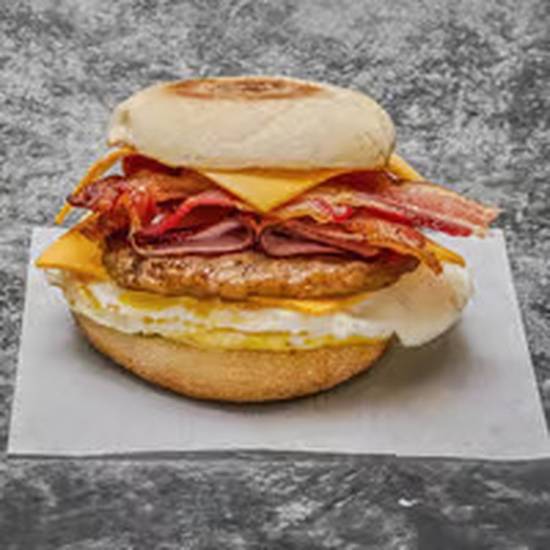 The Hungry Hound is a Big, Bold sandwich that will satisfy your cravings with its delicious combination of 2 eggs, bacon, sausage, ham, and 2 slices of American cheese. Indulge in this hearty and flavorful sandwich that is perfect for breakfast. (You may not even need lunch today now)