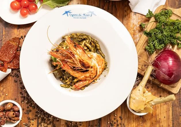 Tonnarello spaghetto short pasta in a homemade Genovese basil pesto & tiger shrimps.
