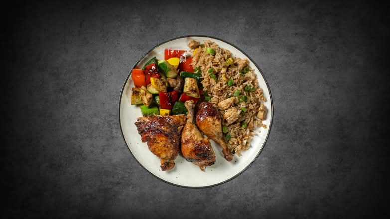2 legs and thigh, Purdue Farm fresh, Grade A, all natural charcoal roasted rotisserie chicken. Served with two regular sides.