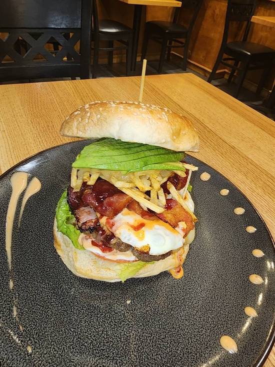Quarter pound Angus beef, bacon, ham, egg, potato chips, lettuce, tomato, avocado, green satori sauce, and pink sauce.