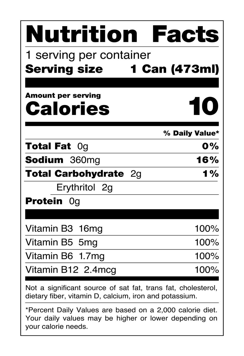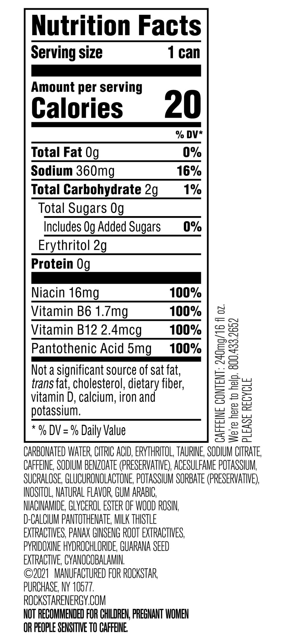 Ingredients: Carbonated Water, Citric Acid, Erythritol, Taurine, Sodium Citrate, Caffeine, Sodium Benzoate (Preservative), Acesulfame Potassium, Sucralose, Glucuronolactone, Potassium Sorbate (Preservative), Inositol, Natural Flavor, Gum Arabic, Niacinamide, Glycerol Ester Of Wood Rosin, D-Calcium Pantothenate, Milk Thistle Extractives, Panax Ginseng Root Extractives, Pyridoxine Hydrochloride, Guarana Seed Extractive, Cyanocobalamin