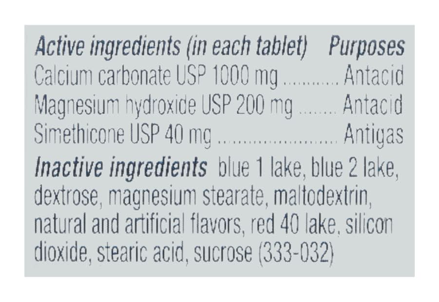 Ingredients: In Each Tablet: Active Ingredients: Calcium Carbonate USP (1000 mg), Antacid; Magnesium Hydroxide USP (200 mg), Antacid; Simethicone USP (40 mg), Antigas. Inactive Ingredients: Blue 1 Lake, Blue 2 Lake, Dextrose, Magnesium Stearate, Maltodextrin, Natural and Artificial Flavors, Red 40 Lake, Silicon Dioxide, Stearic Acid, Sucrose (333-032)