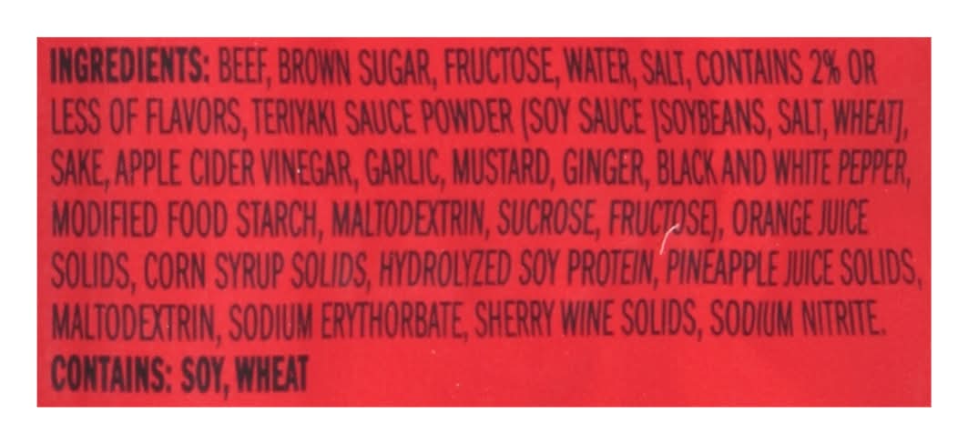 Ingredients: Beef, Brown Sugar, Fructose, Water, Salt, Contains 2% or Less of Flavors, Teriyaki Sauce Powder (Soy Sauce (Soybeans, Salt, Wheat, Sake, Apple Cider Vinegar, Garlic, Mustard, Ginger, Black and White Pepper, Modified Food Starch, Maltodextrin, Sucrose, Fructose), Orange Juice Solids, Corn Syrup Solids, Hydrolyzed Soy Protein, Pineapple Juice Solids Maltodextrin, Sodium Erythorbate, Sherry Wine Solids, Sodium Nitrite Contains: Corn, Wheat, Soybeans, Mustard