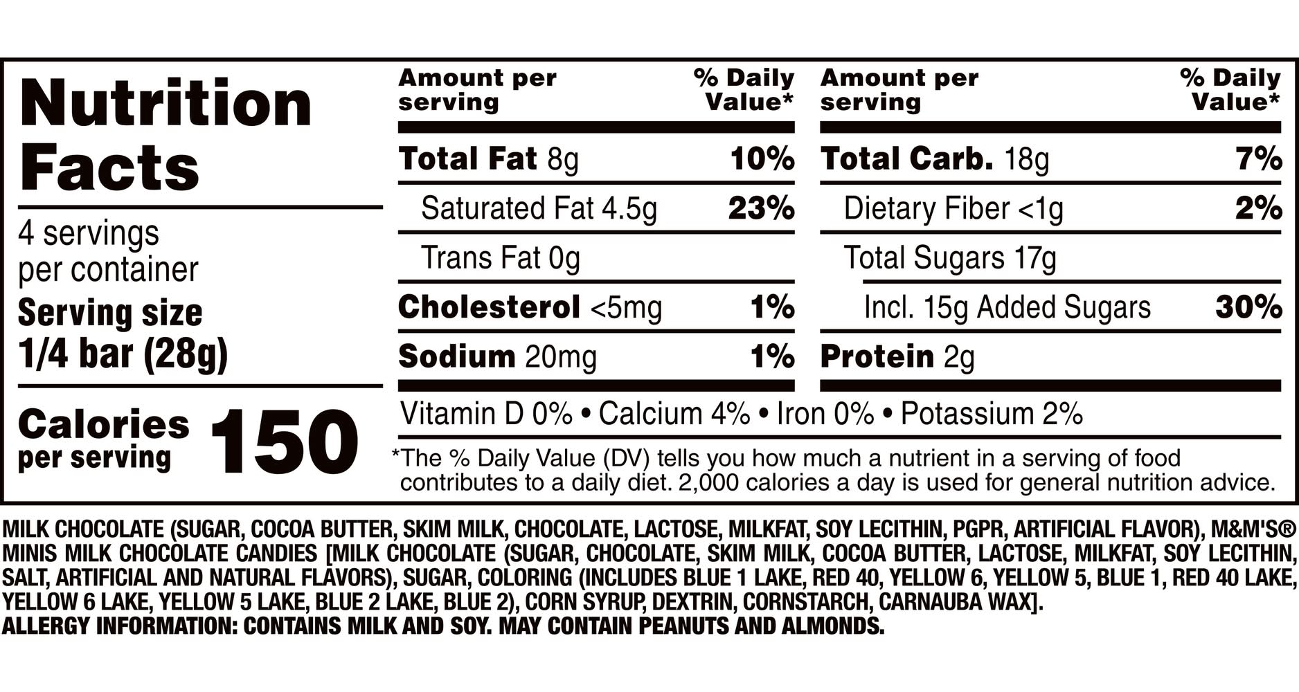 Ingredients: Milk Chocolate (Sugar, Cocoa Butter, Skim Milk, Chocolate, Lactose, Milkfat, Soy Lecithin, PGPR, Artificial Flavor), MM's® Minis Milk Chocolate Candies [Milk Chocolate (Sugar, Chocolate, Skim Milk, Cocoa Butter, Lactose, Milkfat, Soy Lecithin, Salt, Natural Flavor), Sugar, Colors (Includes Blue 1 Lake, Red 40, Yellow 6, Yellow 5, Blue 1, Red 40 Lake, Yellow 6 Lake, Yellow 5 Lake, Blue 2 Lake, Blue 2), Corn Syrup, Dextrin, Cornstarch, Carnauba Wax]. Contains: Contains milk and soy. May contain peanuts and almonds.