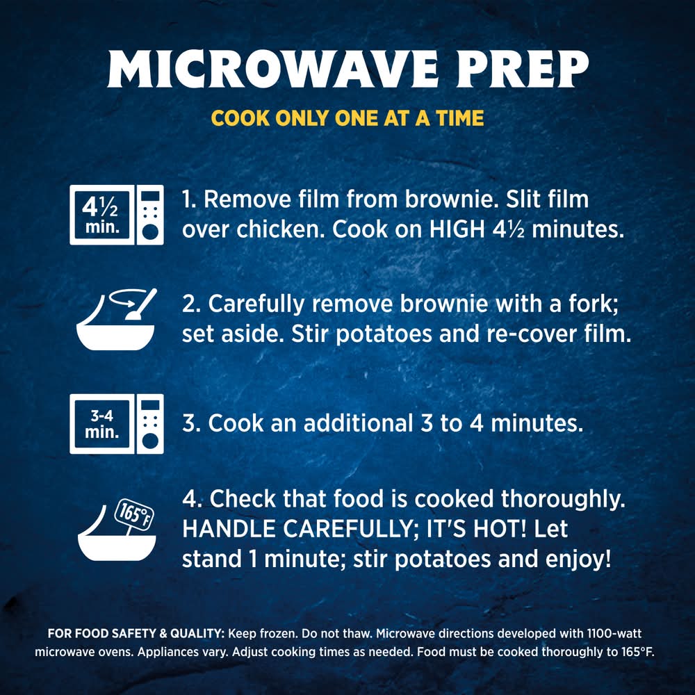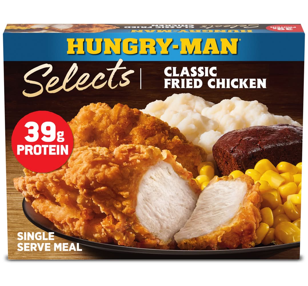 Send hunger for the hills with the great flavors and satisfying portions found in hungry-man selects classic fried chicken. This complete frozen meal features tender white and dark chicken portions, home-style mashed potatoes and sweet corn side dishes and a chocolate brownie dessert. This frozen meal offers 39 grams of protein per serving for a satisfying frozen entree that is perfect anytime hunger strikes. Hungry-man selects microwave meals are a convenient choice for work lunches a tv dinner or easy meals to tackle those tummy rumbles. Simply follow the instructions on the package to microwave or cook in a conventional oven. Each package contains one full meal that is perfect for busy lifestyles and hearty appetites. Store the convenient frozen entrees in your freezer until you're ready to enjoy. Try other hungry-man frozen meals to find your favorite. Hungry-man offers big portions for big appetites. Conagra Brands, P.O. Box 3534,Chicago,IL,60654