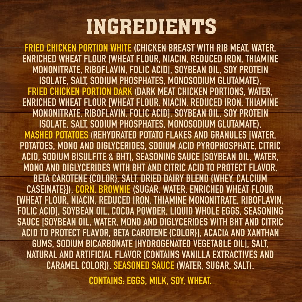 Ingredients: Fried Chicken Portion White: Chicken Breast with Rib Meat, Water, Enriched Wheat Flour (Wheat Flour, Niacin, Reduced Iron, Thiamine Mononitrate, Riboflavin, Folic Acid), Soybean Oil, Soy Protein Isolate, Salt, Sodium Phosphates, Monosodium Glutamate, Fried Chicken Portion Dark: Dark Meat Chicken Portions, Water, Enriched Wheat Flour (Wheat Flour, Niacin, Reduced Iron, Thiamine Mononitrate, Riboflavin, Folic Acid), Soybean Oil, Soy Protein Isolate, Salt, Sodium Phosphates, Monosodium Glutamate, Mashed Potatoes: Rehydrated Potato Flakes and Granules (Water, Potatoes, Mono and Diglycerides, Disodium Dihydrogen Pyrophosphate, Sodium Bisulfite, Citric Acid, BHT), Soybean Oil, Water, Salt, Dried Dairy Blend (Whey, Calcium Caseinate), Mono- and Diglycerides, BHT and Citric Acid (to Protect Flavor), Beta Carotene (Color), Corn: Corn, Water, Sugar, Salt, Brownie: Sugar, Water, Enriched Wheat Flour (Wheat Flour, Niacin, Reduced Iron, Thiamine Mononitrate, Riboflavin, Folic Acid), Soybean Oil, Cocoa Powder, Liquid Whole Eggs, Less than 2% of: Acacia and Xanthan Gums, Sodium Bicarbonate (Contains Hydrogenated Vegetable Oil), Salt, Mono and Diglycerides with BHT and Citric Acid to Protect Flavor, Caramel Color, Natural and Artificial Flavor, Vanilla Extract, Beta Carotene (Color) Contains: Wheat, Soybeans, Corn, Milk, Eggs