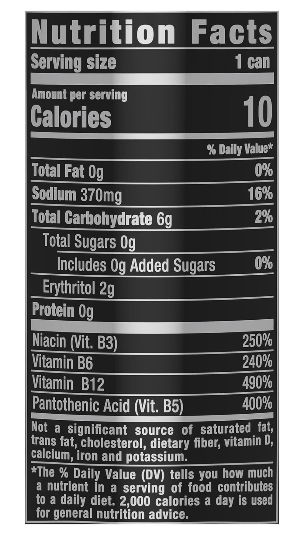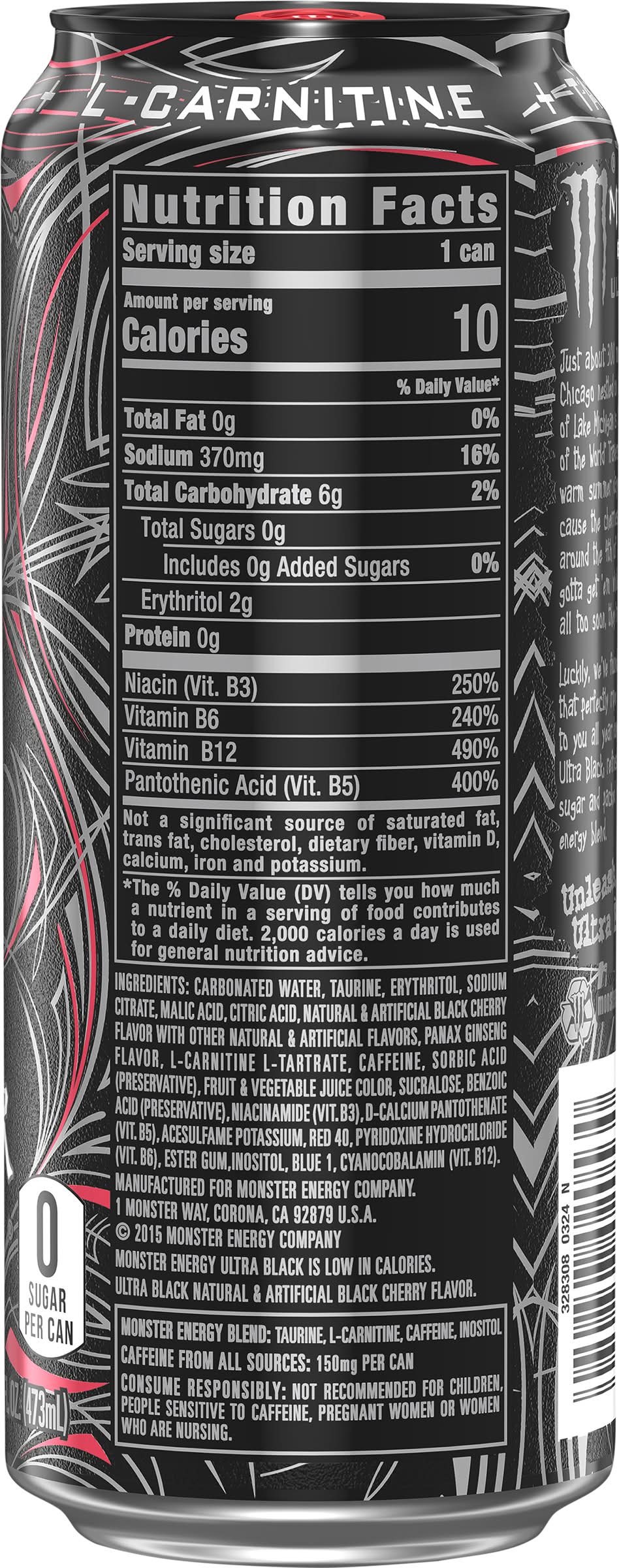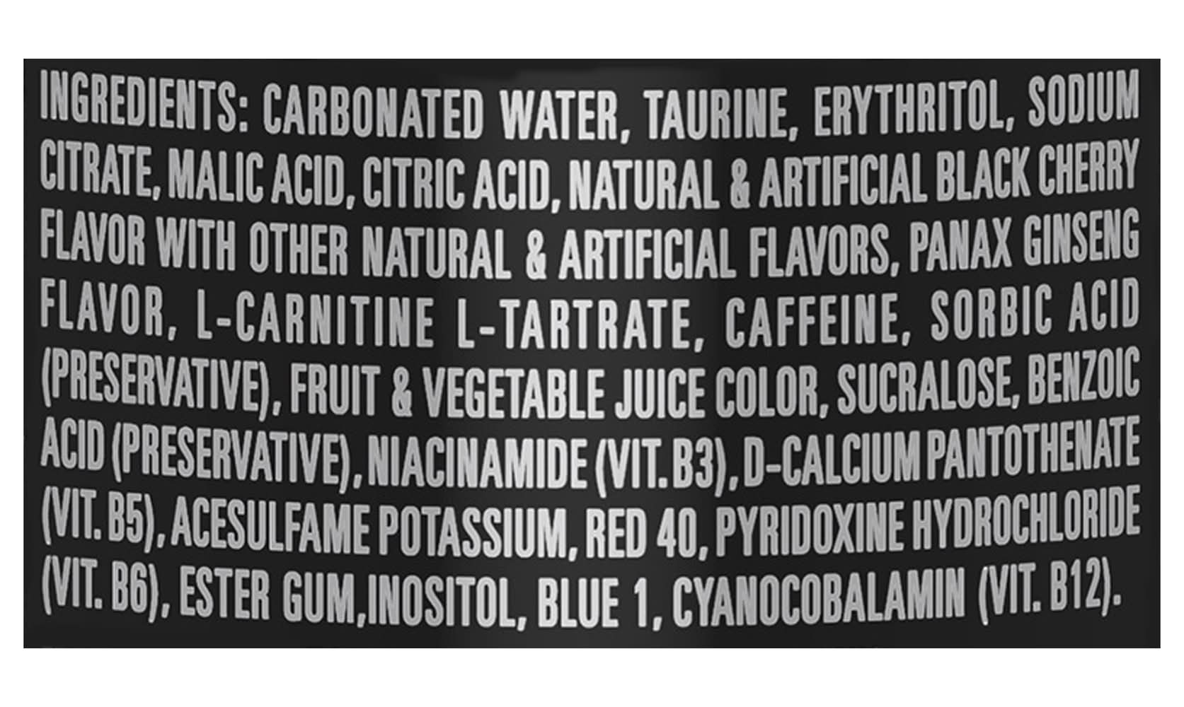 Ingredients: Carbonated Water, Taurine, Erythritol, Sodium Citrate, Malic Acid, Citric Acid, Natural & Artificial Black Cherry Flavor with Other Natural & Artificial Flavors, Panax Ginseng Flavor, L-Carnitine L-Tartrate, Caffeine, Sorbic Acid (Preservative), Fruit & Vegetable Juice Color, Sucralose, Benzoic Acid (Preservative), Niacinamide (Vit. B3), D-Calcium Pantothenate (Vit. B5), Acesulfame Potassium, Red 40, Pyridoxine Hydrochloride (Vit. B6), Ester Gum, Inositol, Blue 1, Cyanocobalamin (Vit. B12).
