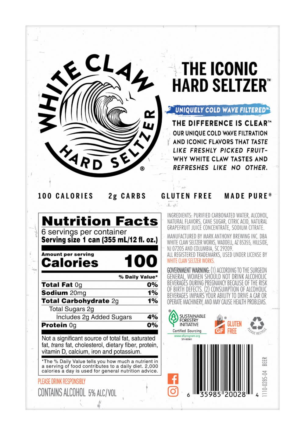 Crafted with quality ingredients, White Claw Ruby Grapefruit is made from a blend of seltzer water, gluten-free alcohol. • Flavor: Ruby grapefruit • Pack size: 6 • Alcohol by volume: 5% • Mark Anthony Brands Inc, DBA White Claw Seltzer Works, Chicago, IL, 60661 • Packaging: Reusable