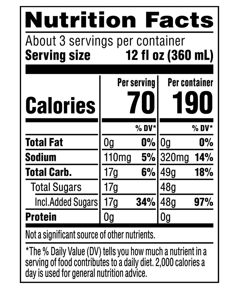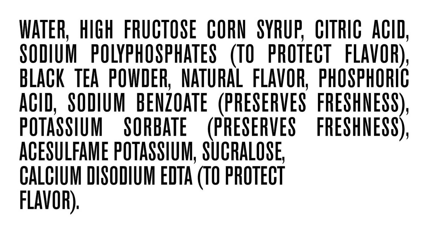 Ingredients: Water, High Fructose Corn Syrup, Citric Acid, Sodium Polyphosphates (to Protect Flavor), Black Tea Powder, Natural Flavor, Phosphoric Acid, Sodium Benzoate (Preserves Freshness), Potassium Sorbate (Preserves Freshness), Acesulfame Potassium, Sucralose, Calcium Disodium EDTA (to Protect Flavor) Contains: Corn (Maize)