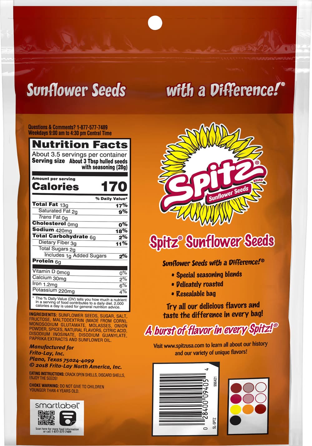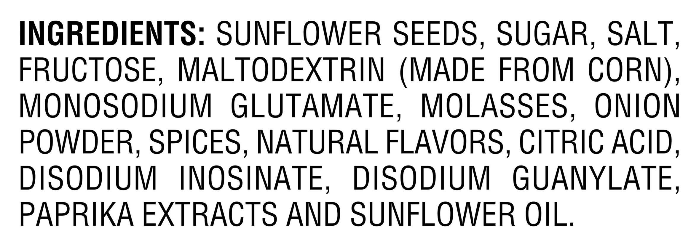 Ingredients: Sunflower Seeds, Sugar, Salt, Fructose, Maltodextrin Made from Corn, Monosodium Glutamate, Molasses, Onion Powder, Spices, Natural Flavors, Citric Acid, Disodium Inosinate, Disodium Guanylate, Paprika Extracts and Sunflower Oil