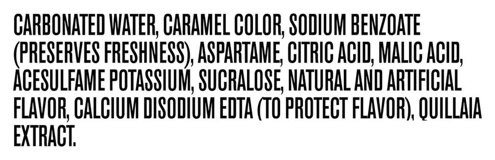 Ingredients: Carbonated Water, Caramel Color, Sodium Benzoate (Preserves Freshness), Aspartame, Citric Acid, Malic Acid, Acesulfame Potassium, Sucralose, Natural and Artificial Flavor, Calcium Disodium EDTA (to Protect Flavor), Quillaia Extract