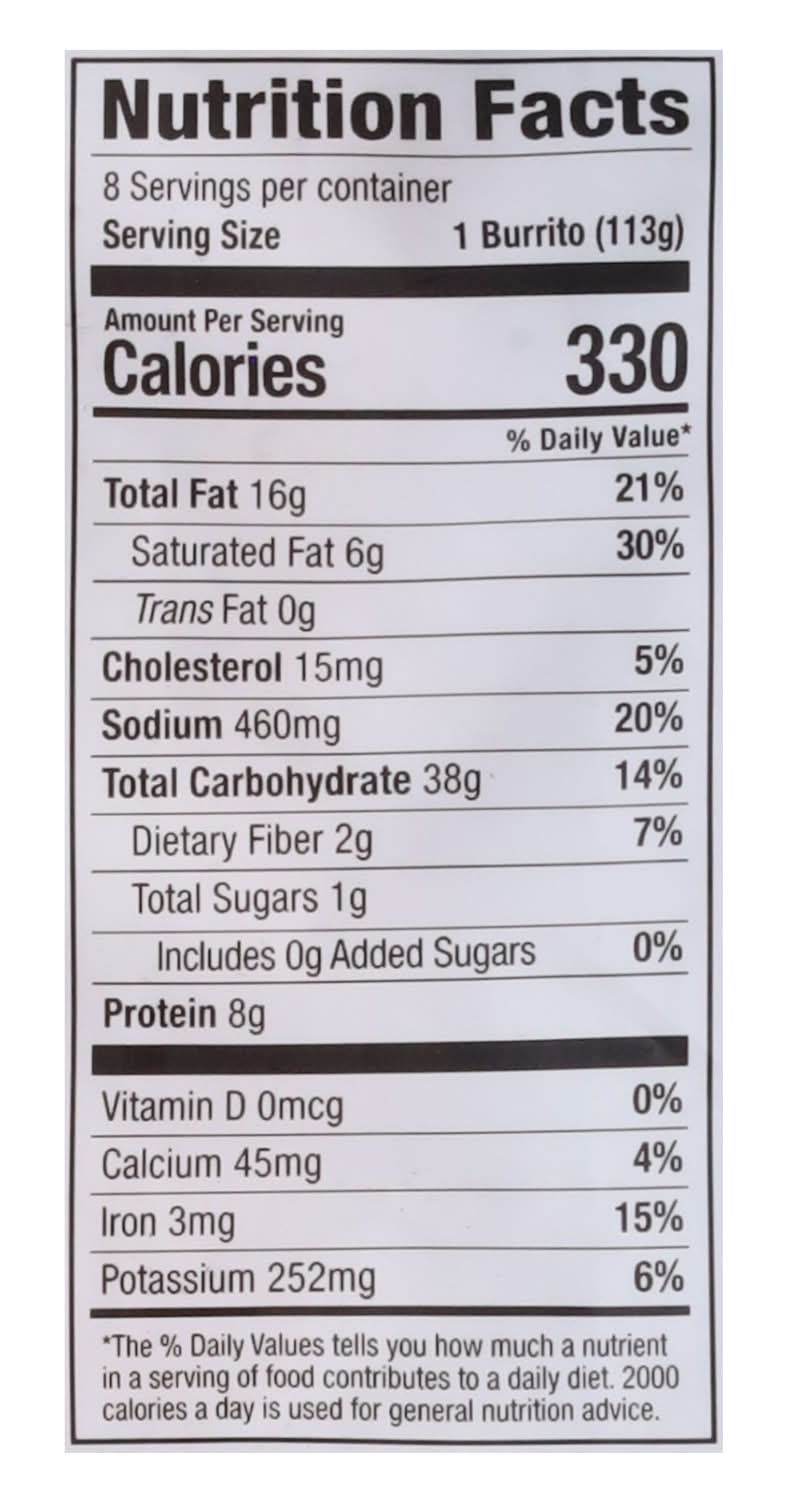 Directions for use: High. Place 1 burrito on microwave safe plate. Frozen: 1 Minute 15 seconds. Let product stand 30 seconds before eating. Oven: Preheat oven to 375 degrees F. Place burritos on baking sheet with 1 inch between burritos. Bake uncovered. Frozen: Cook for 12 minutes, flip and cook for additional 12 minutes. Let product stand 1 minute before eating. Air Fryer: 380 degrees F. Place 2 burritos in air fryer basket. Frozen: Cook for 6 minutes, flip and cook for additional 6 minutes. Let product stand 1 minute before eating. For food safety and quality, internal product temperature must reach 165 degrees F. Since ovens vary, cooking times may require adjusting. Caution: Product may be hot. Cook & serve. Storage recommendation: Keep frozen
