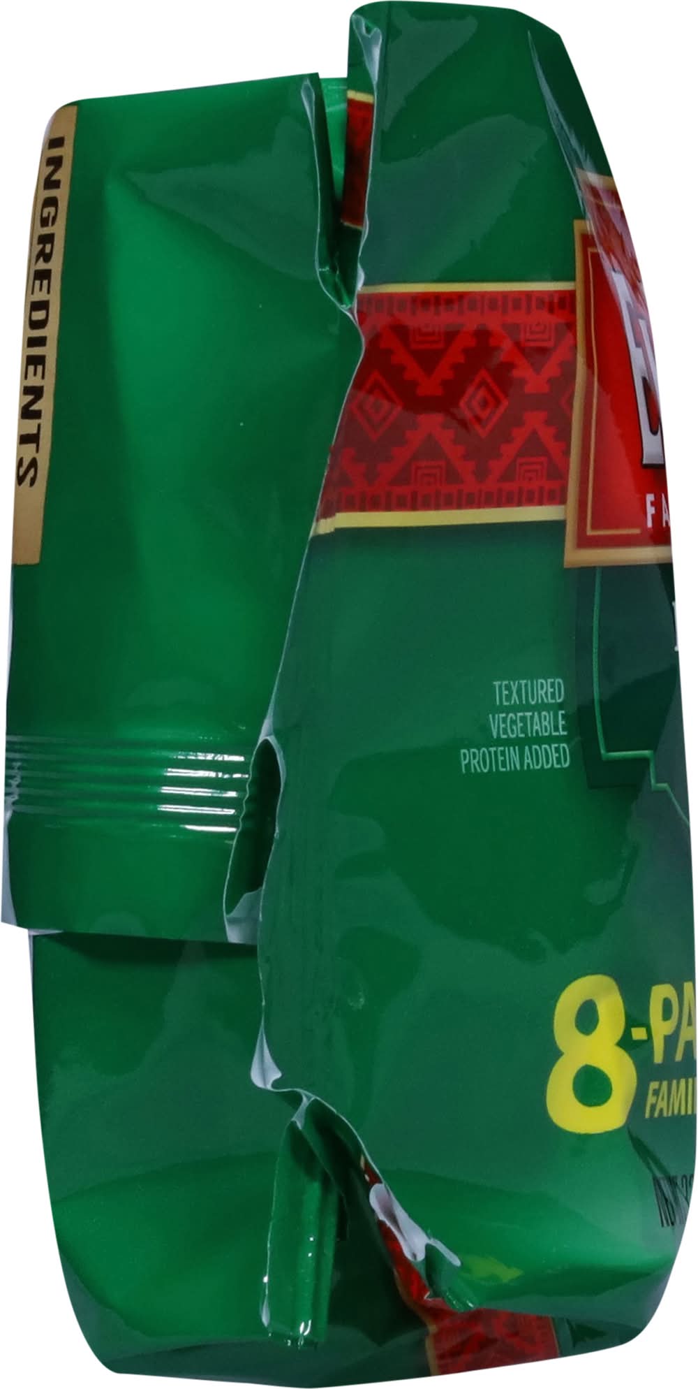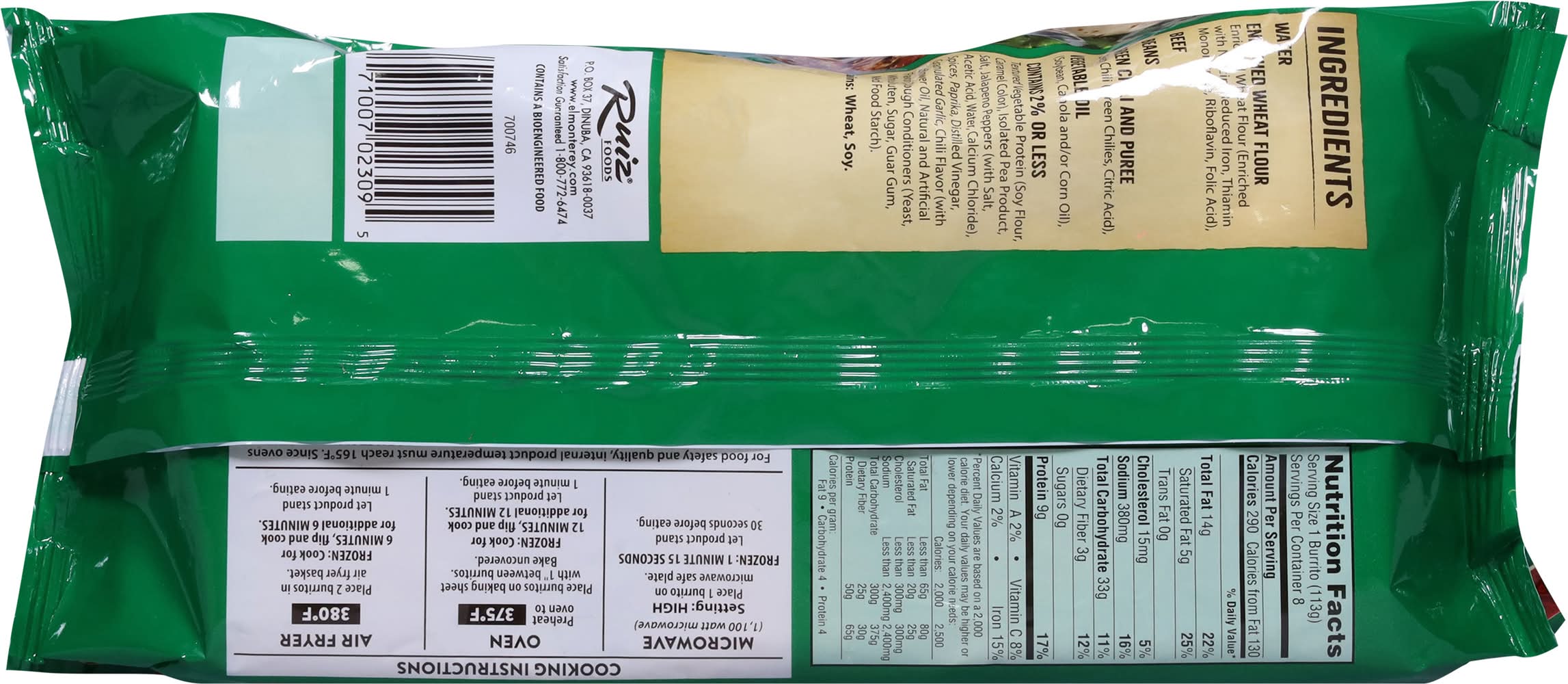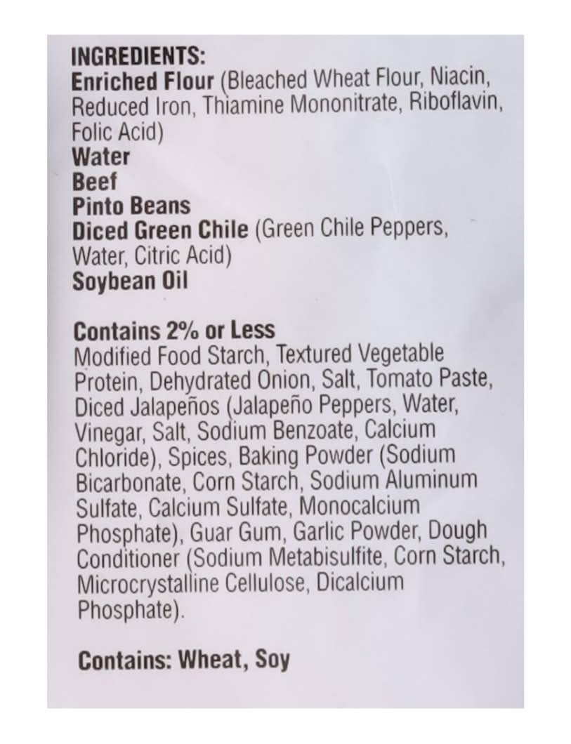 Ingredients: Enriched Flour (Bleached Wheat Flour, Niacin, Reduced Iron, Thiamine Mononitrate, Riboflavin, Folic Acid) Water Beef Pinto Beans Diced Green Chile (Green Chile Peppers, Water, Citric Acid) Soybean Oil Contains 2% or Less Modified Food Starch, Textured Vegetable Protein, Dehydrated Onion, Salt, Tomato Paste, Diced Jalapenos (Jalapeno Peppers, Water, Vinegar, Salt, Sodium Benzoate, Calcium Chloride), Spices, Baking Powder (Sodium Bicarbonate, Corn Starch, Sodium Aluminum Sulfate, Calcium Sulfate, Monocalcium Phosphate), Guar Gum, Garlic Powder, Dough Conditioner (Sodium Metabisulfite, Corn Starch, Microcrystalline Cellulose, Dicalcium Phosphate) Contains: Wheat, Soybeans, Corn, Sulfites