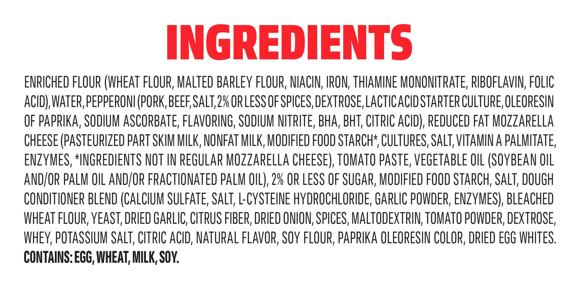 Ingredients: ENRICHED FLOUR (WHEAT FLOUR, MALTED BARLEY FLOUR, NIACIN, IRON, THIAMINE MONONITRATE, RIBOFLAVIN, FOLIC ACID), WATER, PEPPERONI MADE WITH PORK, CHICKEN, AND BEEF (PORK, MECHANICALLY SEPARATED CHICKEN, BEEF, SALT, 2% OR LESS OF SPICES, DEXTROSE, LACTIC ACID STARTER CULTURE, OLEORESIN OF PAPRIKA COLOR, SODIUM ASCORBATE, FLAVORING, SODIUM NITRITE, BHA, BHT, CITRIC ACID TO HELP PROTECT FLAVOR), REDUCED FAT MOZZARELLA CHEESE (PASTEURIZED PART SKIM MILK, NONFAT MILK, MODIFIED FOOD STARCH*, CULTURES, SALT, VITAMIN A PALMITATE, ENZYMES, *INGREDIENTS NOT IN REGULAR MOZZARELLA CHEESE), TOMATO PASTE, VEGETABLE OIL (SOYBEAN OIL AND/OR PALM OIL AND/OR FRACTIONATED PALM OIL AND/OR CANOLA OIL), 2% OR LESS OF SUGAR, MODIFIED FOOD STARCH, SALT, BLEACHED WHEAT FLOUR, DOUGH CONDITIONER BLEND (CALCIUM SULFATE, SALT, L-CYSTEINE HYDROCHLORIDE, GARLIC POWDER, ENZYMES), DRIED GARLIC, DRIED ONION, MALTODEXTRIN, SPICES, CITRUS FIBER, DEXTROSE, WHEY, POTASSIUM SALT, YEAST, SOY LECITHIN, CITRIC ACID, NATURAL FLAVOR, SOY FLOUR, PAPRIKA OLEORESIN COLOR, EGG WHITES. Contains: CONTAINS: EGG, WHEAT, MILK, SOY.