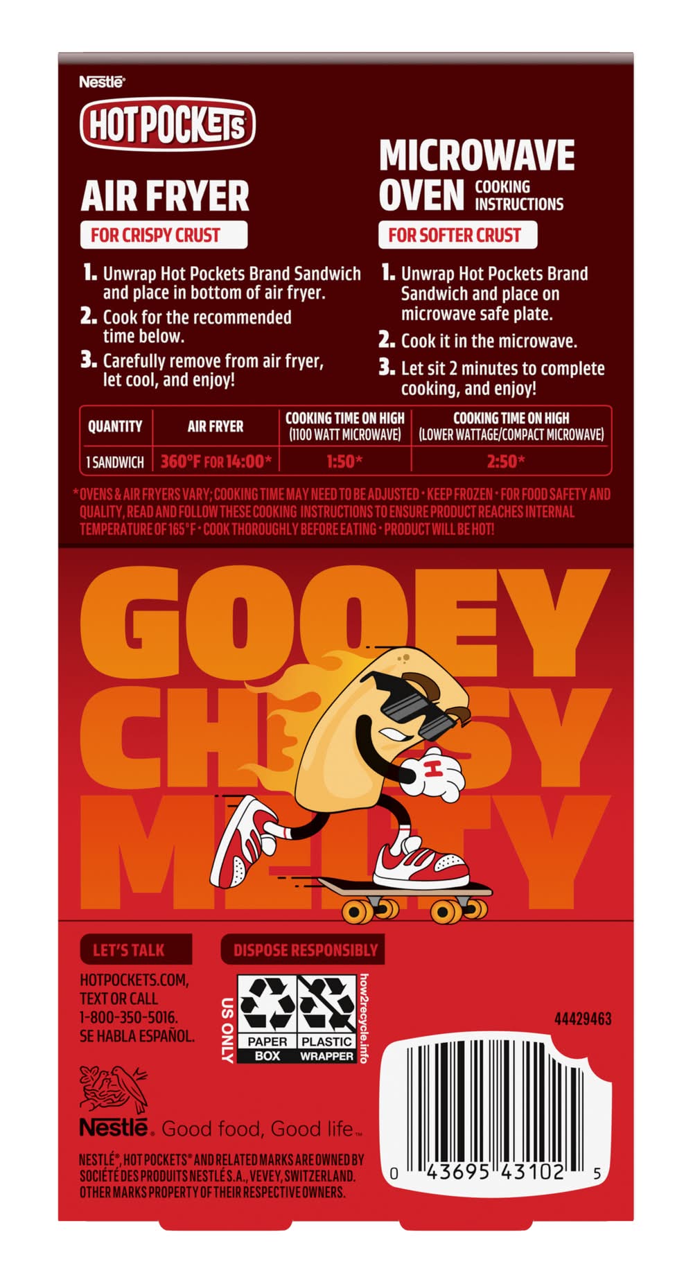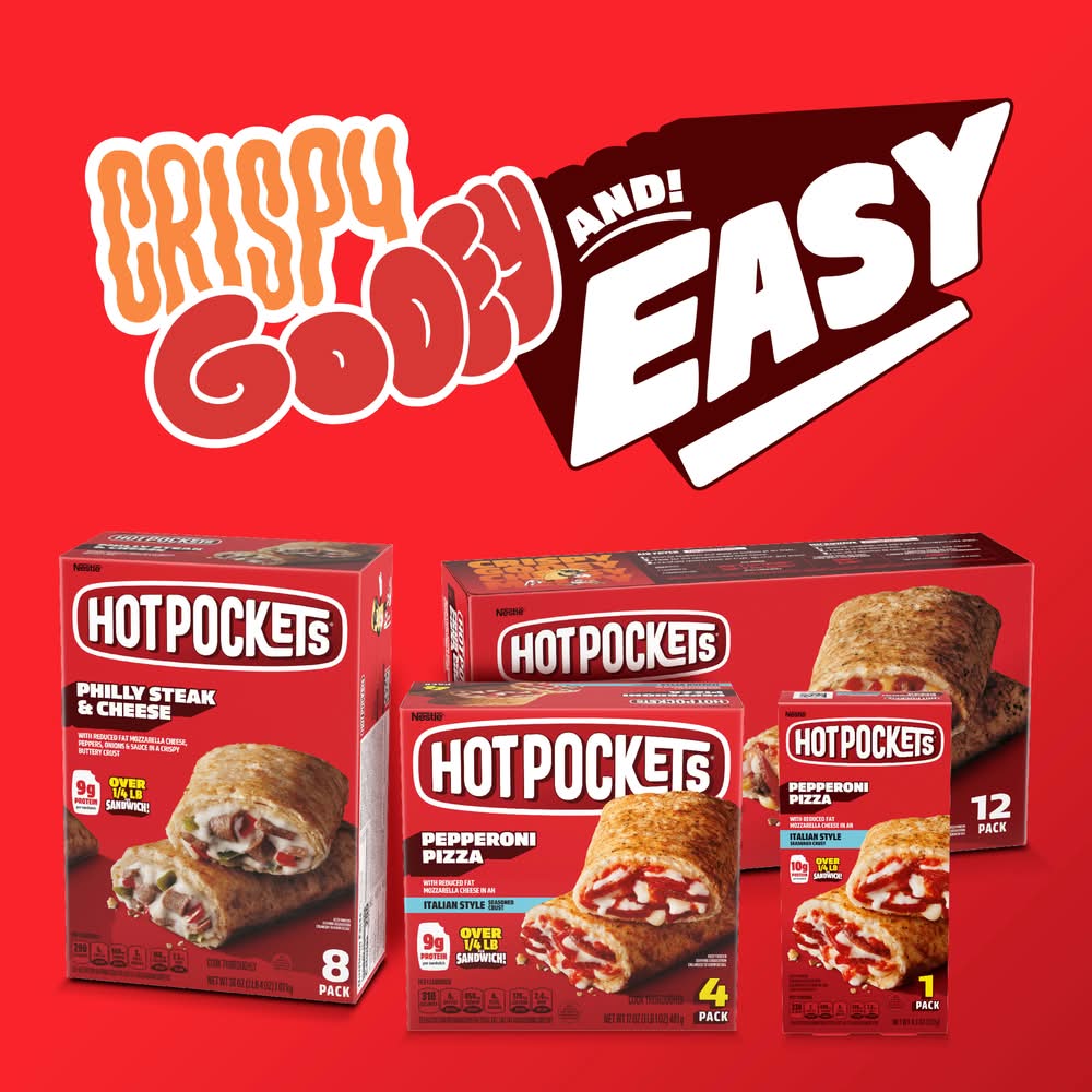 Dive into the cheesy, saucy and savory world of snacking with Hot Pockets Pepperoni Pizza frozen snacks. Our frozen sandwiches are loaded with premium pepperoni, along with reduced fat mozzarella cheese, stuffed inside a delicious crispy crust. These indulgent pepperoni pizza Hot Pockets aren’t your average pizza rolls or frozen snack. Hot Pockets are hot and delicious every time. These frozen sandwiches are hunger’s worst nightmare, delivering the bold flavors of the classic comfort food pepperoni and cheese pizza in a hearty microwaveable snack. Great for gaming all night, a quick snack after school or a quick bite before heading out the door -- Hot Pockets Pepperoni Pizza snacks are perfect for any occasion. These frozen sandwiches are a good source of protein with 10 grams per serving. Cook this microwave food for 1 minute 50 seconds on high for a quick on-the-go snack, or air fry at 360 degrees Fahrenheit for 14 minutes if you want a crispier crust. Hot Pockets are hot and delicious every time. Keep Hot Pockets Pepperoni Pizza sandwich frozen until ready to cook and eat. • Flavor: Italian style • Number of servings: 1