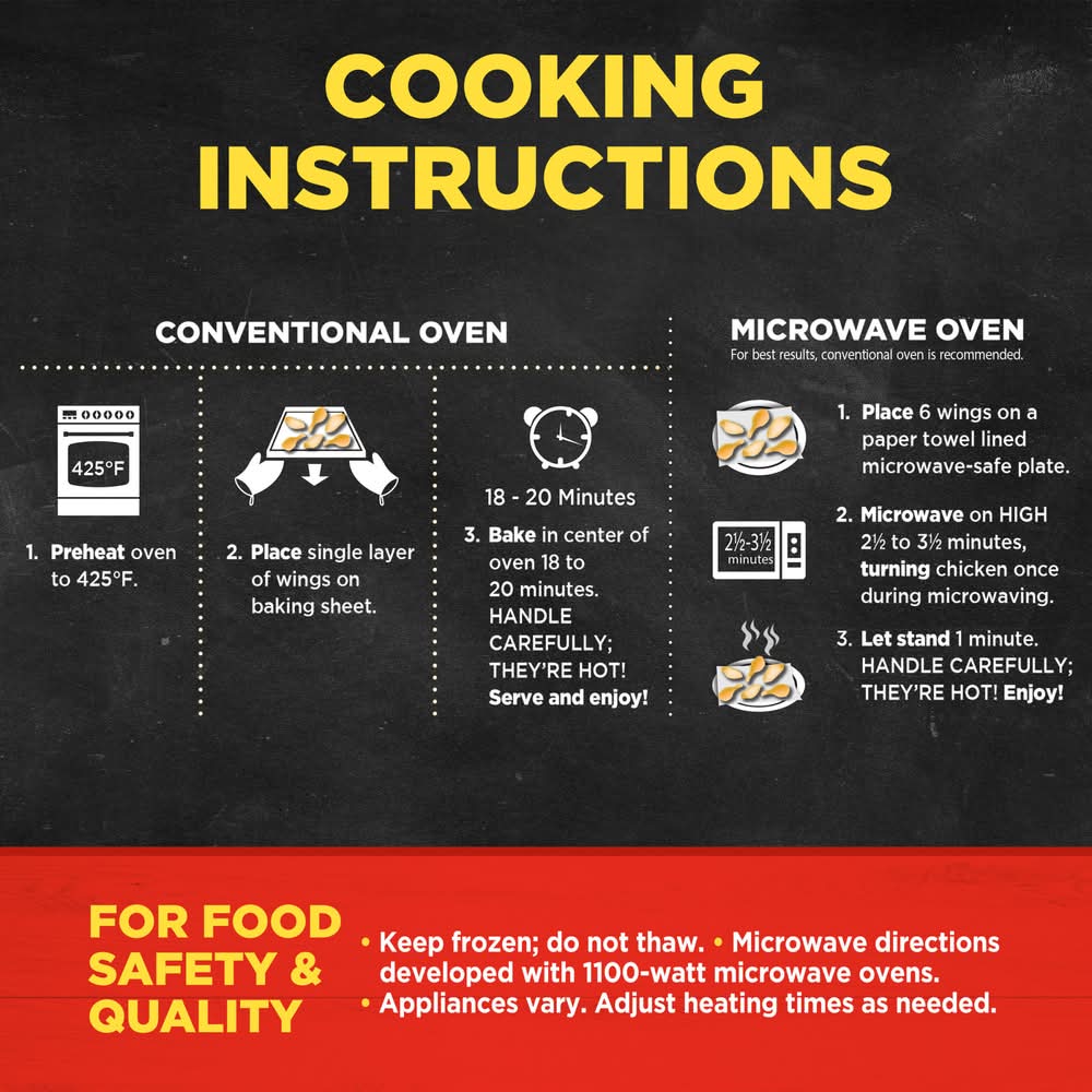 Directions for use: Directions: For Food Safety and Quality: Keep frozen; do not thaw. Microwave directions developed with 1100-watt microwave ovens. Appliances vary. Adjust heating times as needed. Conventional Oven: 1. Preheat oven to 425 degree F. 2. Place single layer of wings on baking sheet. 18 - 20 minutes. 3. Bake in center of oven 18 to 20 minutes. Handle carefully; they're hot! Serve and enjoy! Microwave Oven: For best results, conventional oven is recommended. 1. Place 6 wings on a paper towel lined microwave-safe plate. 2. Microwave on high 2 1/2 to 3 1/2 minutes, turning chicken once during microwaving. 3. Let stand 1 minute. Handle carefully; They're hot! enjoy!\r Keep frozen. Storage recommendation: Keep frozen.