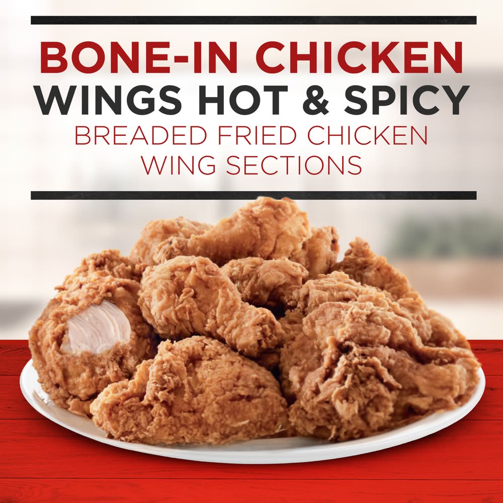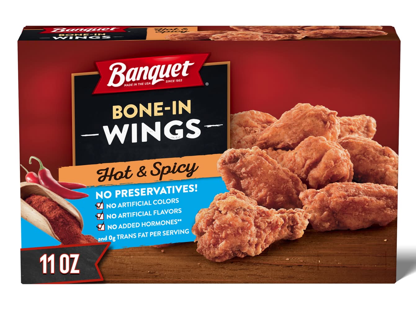 Banquet Hot and Spicy Bone In Wings feature hearty frozen chicken wings in a signature seasoned breading for a delicious flavor with a kick. This spicy chicken is made with no preservatives, artificial colors, artificial flavors or added hormones*. Easily heated in the microwave or oven, these hot wings are ready in minutes for a quick, tasty meal. Banquet Hot and Spicy Bone In Frozen Wings are sure to spice up your meals and are great frozen appetizers for parties. To prepare the frozen food, simply follow the instructions on the package to heat in a conventional oven for crisp, golden chicken, or in the microwave for quicker cooking time. Keep this 11 ounce box of frozen meat in the freezer until you're ready to cook the spicy chicken wings. Proudly made in the U.S.A. for over 60 years, Banquet has been making delicious food the whole family loves. * Federal regulations prohibit the use of added hormones in chicken • Flavor: Hot-spicy • Packaging: Reusable
