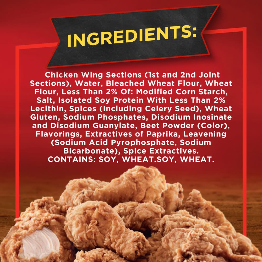 Ingredients: Chicken Wing Sections (1st and 2nd Joint Sections), Water, Bleached Wheat Flour, Wheat Flour, Less Than 2% Of: Modified Corn Starch, Salt, Isolated Soy Protein With Less Than 2% Lecithin, Spices (Including Celery Seed), Wheat Gluten, Sodium Phosphates, Disodium Inosinate and Disodium Guanylate, Beet Powder (Color), Flavorings, Extractives of Paprika, Leavening (Sodium Acid Pyrophosphate, Sodium Bicarbonate), Spice Extractives. CONTAINS: SOY, WHEAT. Contains: Soy, Wheat