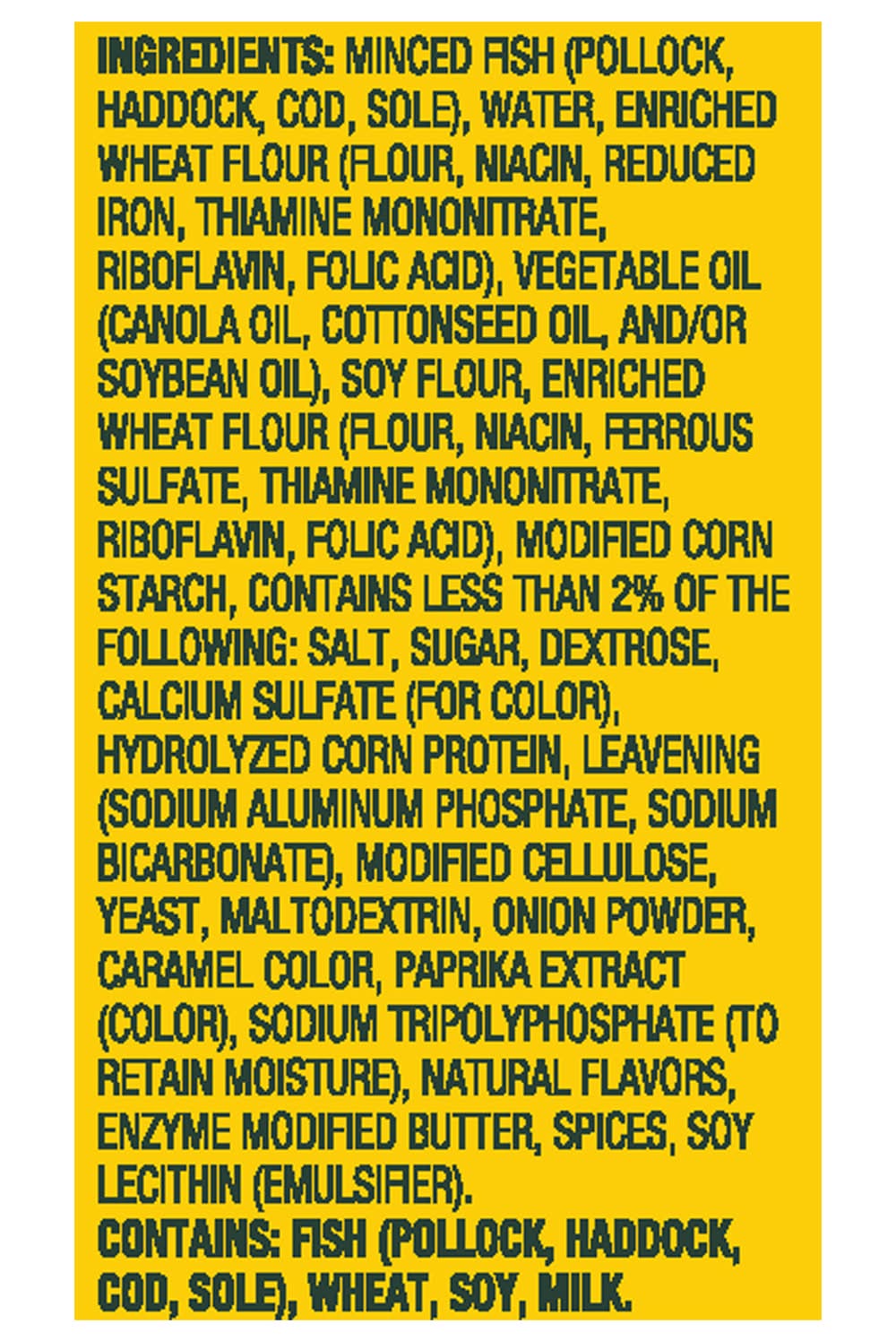 Ingredients: Minced Fish (Pollock, Haddock, Cod, Sole), Water, Enriched Wheat Flour (Flour, Niacin, Reduced Iron, Thiamine Mononitrate, Riboflavin, Folic Acid), Vegetable Oil (Canola Oil, Cottonseed Oil, and/or Soybean Oil), Soy Flour, Enriched Wheat Flour (Flour, Niacin, Ferrous Sulfate, Thiamine Mononitrate, Riboflavin, Folic Acid), Modified Corn Starch, Contains Less than 2% of the Following: Salt, Sugar, Dextrose, Calcium Sulfate (for Color), Hydrolyzed Corn Protein, Leavening (Sodium Aluminum Phosphate, Sodium Bicarbonate), Modified Cellulose, Yeast, Maltodextrin, Onion Powder, Caramel Color, Paprika Extract (Color), Sodium Tripolyphosphate (to Retain Moisture), Natural Flavors, Enzyme Modified Butter, Spices, Soy Lecithin (Emulsifier) Contains: Fish, Pollock, Fish, Haddock, Fish, Sole, Wheat, Soybeans, Milk, Fish