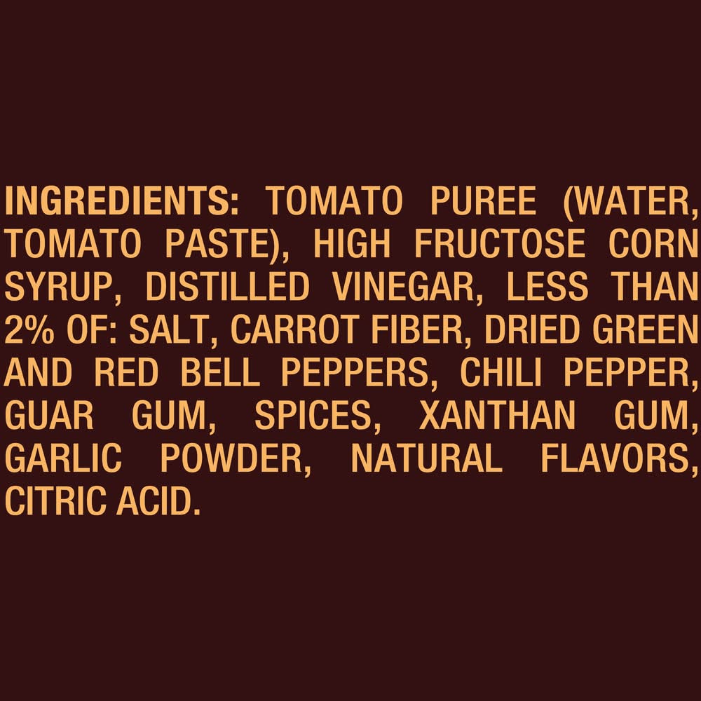 Ingredients: Tomato Puree (Water Tomato Paste), High Fructose Corn Syrup, Distilled Vinegar, Less than 2% of: Salt, Modified Potato Starch, Dried Green and Red Bell Peppers, Chili Pepper, Guar Gum, Spices, Xanthan Gum, Water, Citric Acid, Garlic Powder, Natural Flavors