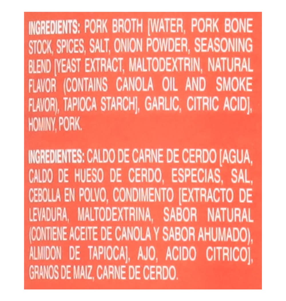 Ingredients: Pork Broth [Water, Pork Bone Stock, Spices, Salt, Onion Powder, Seasoning Blend [Yeast Extract, Maltodextrin, Natural Flavor (Contains Canola Oil and Smoke Flavor), Tapioca Starch], Garlic, Citric Acid], Hominy, Pork