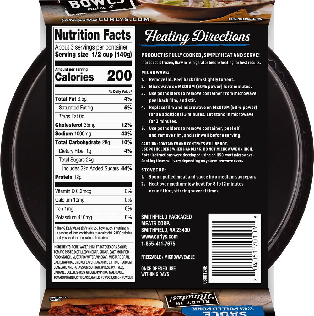Directions for use: Heating Directions: Product is fully cooked, simply heat and serve! If product is frozen, thaw in refrigerator before heating for best results. Microwave: 1. Remove lid. Peel back film slightly to vent. 2. Microwave on medium (50% power) for 3 minutes. 3. Use potholders to remove container from microwave, peel back film, and stir. 4. Replace film and microwave on medium (50% power) for an additional 3 minutes. Let stand in microwave for 2 minutes. 5. Use potholders to remove container, peel off and remove film, and stir well before serving. Microwave ovens vary in power. Heating times are approximate. Stovetop: 1. Spoon pulled meat and sauce into medium saucepan. 2. Heat over medium-low heat for 8 to 12 minutes or until hot, stirring several times. Caution: Container and contents will be hot. Use potholders when handling. Do not microwave on high. Note: Instructions were developed using an 1150-watt microwave. Cooking times will vary depending on your microwave oven. Keep refrigerated. Once opened use within 5 days. Storage recommendation: Keep refrigerated.