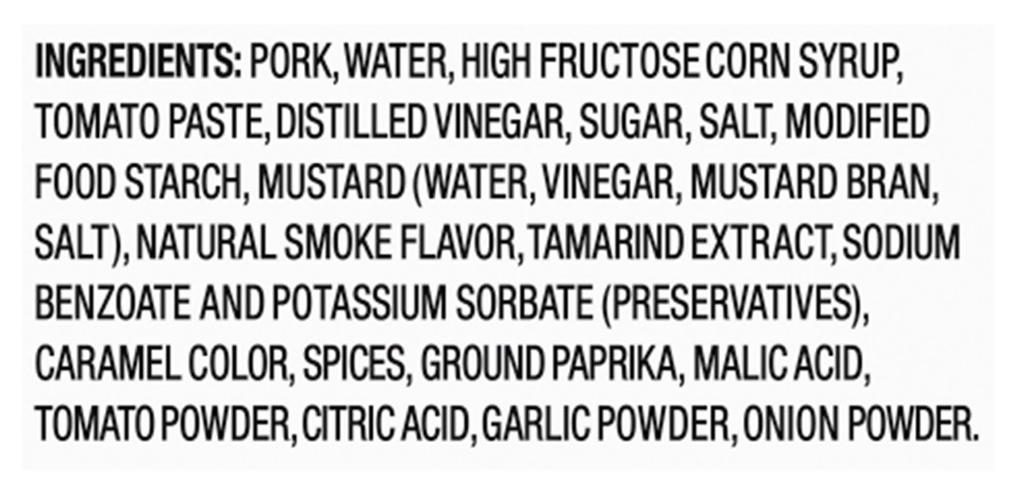 Ingredients: Pork, Water, High Fructose Corn Syrup, Tomato Paste, Distilled Vinegar, Sugar, Salt, Modified Food Starch, Mustard (Water, Vinegar, Mustard Bran, Salt), Natural Smoke Flavor, Tamarind Extract, Sodium Benzoate and Potassium Sorbate (Preservatives), Caramel Color, Spices, Ground Paprika, Malic Acid, Tomato Powder, Citric Acid, Garlic Powder, Onion Powder Contains: Mustard