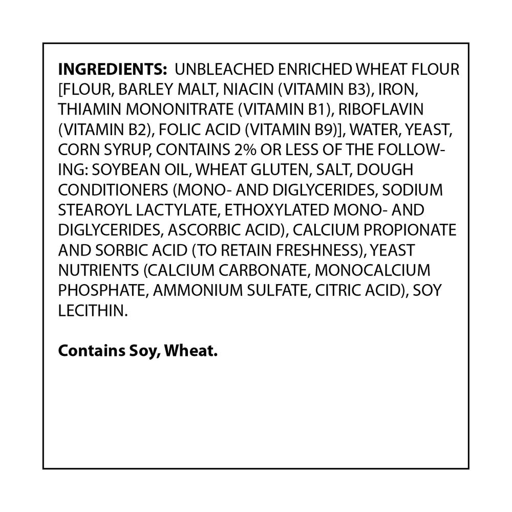Ingredients: UNBLEACHED ENRICHED WHEAT FLOUR [FLOUR, BARLEY MALT, NIACIN (VITAMIN B3), IRON, THIAMIN MONONITRATE (VITAMIN B1), RIBOFLAVIN (VITAMIN B2), FOLIC ACID (VITAMIN B9)], WATER, YEAST, CORN SYRUP, CONTAINS 2% OR LESS OF THE FOLLOWING: SOYBEAN OIL, WHEAT GLUTEN, SALT, DOUGH CONDITIONERS (ETHOXYLATED MONO AND DIGLYCERIDES, SODIUM STEAROYL LACTYLATE, ASCORBIC ACID), CALCIUM PROPIONATE (TO RETAIN FRESHNESS), YEAST NUTRIENTS (CALCIUM CARBONATE, MONOCALCIUM PHOSPHATE, AMMONIUM SULFATE), SOY LECITHIN. CONTAINS: SOY, WHEAT Contains: Contains soy, wheat.<br />Allergy Advisory: Produced on the same bakery equipment as baking goods containing milk, eggs, nuts or seeds. Therefore, this product may inadvertently contain milk, egg, nuts or seeds to which some people may be allergic.