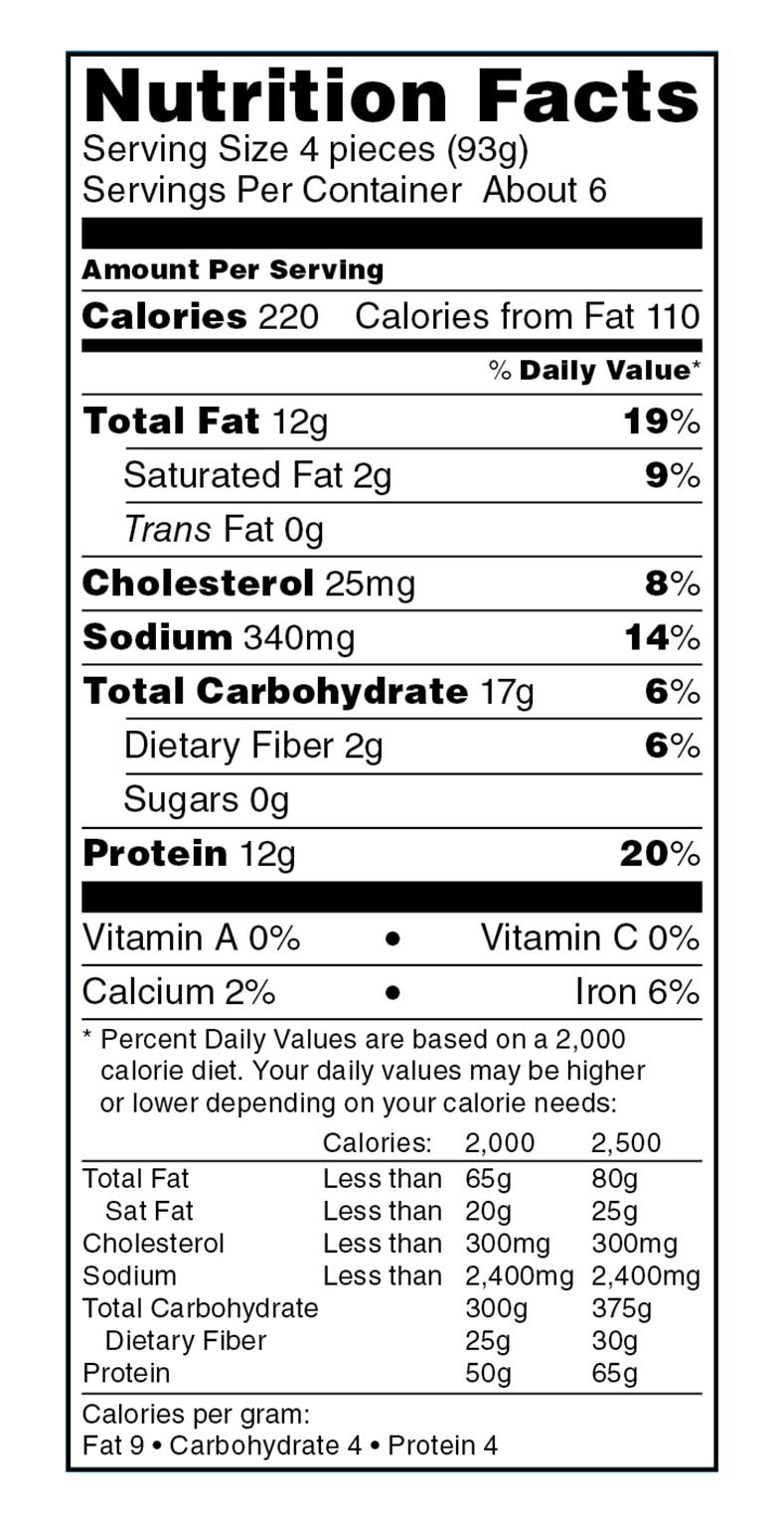 Ingredients: Boneless Skinless Chicken Breast with Rib Meat, Water, Whole Wheat Flour, Wheat Flour, Isolated Soy Protein. Contains 2% or Less of the Following: Flaxseed Meal, Sea Salt, Natural Flavor, Natural Chicken Flavor, Yeast, Extractive of Paprika (Color), Canola Oil, Whole Grain Yellow Corn Flour, Yellow Corn Flour, Corn Starch, Guar Gum, Sugar, Salt Contains: Wheat, Soybeans, Corn