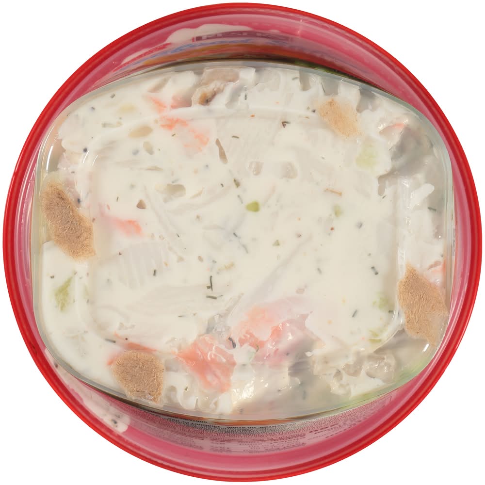Ingredients: Imitation Crab (Fish Protein [Alaska Pollock, Pacific Whiting], Water, Wheat Starch, Mirin Wine Sake, Sugar, Salt, Water, Yeast Extract], Egg Whites, Sorbitol, Soybean Oil, Sugar, Tapioca Starch, Contains 2% or Less of: Natural and Artificial Crab Flavors [Swimming Crab, Maltodextrin, Disodium Guanylate, Disodium Inosinate], Modified Potato Starch, Salt, Potassium Chloride, Sodium Tripolyphosphate, Tetrasodium Pyrophosphate, Paprika Oleoresin, Lycopene, Color Added), Mayonnaise (Soybean Oil, Water, Egg Yolks, Vinegar, Salt), Celery, Onion, Water, Modified Corn Starch, Citric Acid, Sodium Benzoate (Preservative), Potassium Sorbate (Preservative), Black Pepper, Xanthan Gum, Dill, Dehydrated Parsley Contains: Crustacean Shellfish, Fish, Wheat, Eggs, Soybeans