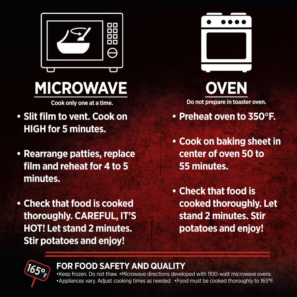 Directions for use: Must be cooked thoroughly. For Food Safety and Quality: Keep frozen. Do not thaw. Microwave directions developed with 1100-watt microwave ovens. Appliances vary. Adjust cooking times as needed. Food must be cooked thoroughly to 165 degrees F. Read and follow these cooking directions. Microwave: Cook only one at a time. Slit film to vent. Microwave on high 5 minutes. Rearrange patties and replace film. Microwave an additional 4 to 5 minutes. Check that food is thoroughly to 165 degrees F. Careful, it's hot! Let stand 2 minutes. Enjoy! Conventional Oven: Do not prepare in toaster oven. Preheat oven to 350 degrees F. Slit film to vent. Cook on baking sheet in center of oven 50 to 55 minutes. Check that food is cooked thoroughly to 165 degrees F. Careful, it's hot! Let stand 2 minutes. Enjoy! Keep frozen. Storage recommendation: Keep frozen.