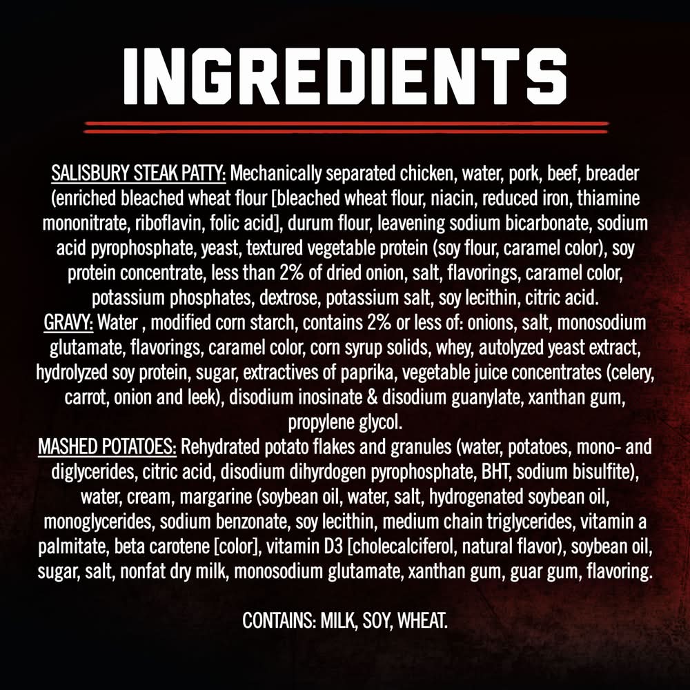 Ingredients: SALISBURY STEAK PATTY: Mechanically Separated Chicken, Pork, Water, Beef, Textured Vegetable Protein (Soy Flour, Caramel Color), Breader (Enriched Bleached Wheat Flour [Bleached Wheat Flour, Niacin, Reduced Iron, Thiamine Mononitrate, Riboflavin, Folic Acid], Durum Flour, Leavening [Sodium Bicarbonate, Sodium Acid Pyrophosphate], Yeast), Soy Protein Concentrate, Salt, Dehydrated Onion, Caramel Color, Flavorings, Sodium Tripolyphosphate, Dextrose, Natural Flavors, Citric Acid, Soy Lecithin. GRAVY: Water, Modified Corn Starch, Salt, Monosodium Glutamate, Flavorings, Caramel Color, Corn Syrup Solids, Whey, Autolyzed Yeast Extract, Hydrolyzed Soy Protein, Sugar, Flavor, Extractives of Paprika, Vegetable Juice Concentrates (Celery, Carrot, Onion And Leek), Disodium Inosinate Disodium Guanylate, Xanthan Gum, Propylene Glycol. MASHED POTATOES: Rehydrated Potato Flakes and Granules (Water, Potatoes, Mono- and Diglycerides, Citric Acid, Disodium Dihydrogen Pyrophosphate, BHT, Sodium Bisulfite), Margarine (Soybean Oil, Water, Salt, Hydrogenated Soybean Oil, Monoglycerides, Sodium Benzoate, Soy Lecithin, Medium Chain Triglycerides, Calcium Disodium EDTA, Vitamin A Palmitate, Beta Carotene [Color], Vitamin D3, Natural and Artificial Flavor), Cream, Soybean Oil, Nonfat Dry Milk, Salt, Sugar, Monosodium Glutamate, Xanthan Gum, Guar Gum, Flavoring. CONTAINS: MILK, SOY, WHEAT. Contains: Milk, Soy, Wheat