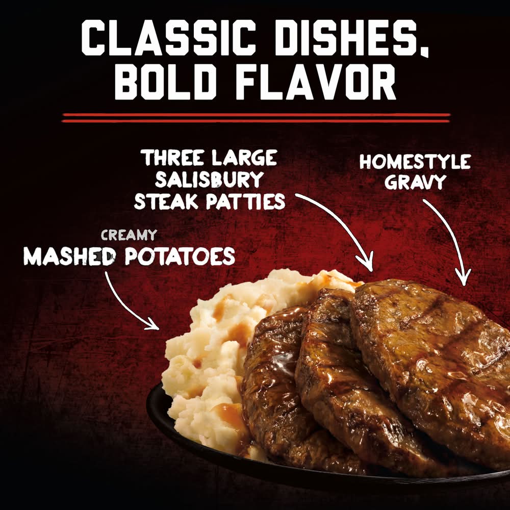 Banquet Mega Meals Salisbury Steak frozen meal brings two classics to your table in minutes. Featuring three Salisbury patties smothered in homestyle gravy and creamy mashed potatoes for delicious frozen meals. This frozen steak dinner offers 32 grams of protein per serving to put hunger in its place. Enjoy Banquet Mega Meals as flavorful frozen lunches or quick and easy frozen dinners any day of the week. Preparation of these ready made meals is easy. Just follow the instructions on the box to heat the frozen food in the oven for fresh-baked flavor or in the microwave for quicker cook time. Store the 16.95 ounce frozen fried steak meal in the freezer until you’re ready to enjoy. Banquet Mega delivers hearty meals that will keep bringing you back for more. • Conagra Brands, PO Box 3534, Chicago, IL, 60654 • Packaging: Reusable