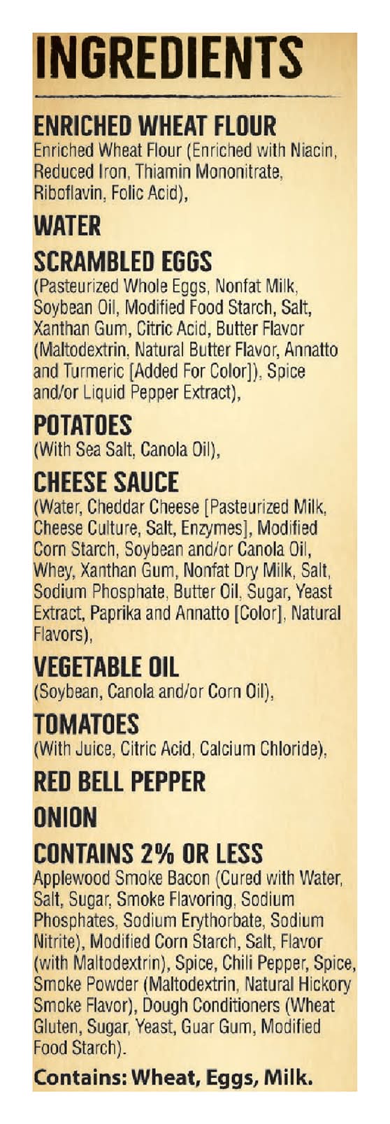 Ingredients: Enriched Wheat Flour: Enriched Wheat Flour (Enriched with Niacin, Reduced Iron, Thiamin Mononitrate, Riboflavin, Folic Acid), Water, Scrambled Eggs: (Pasteurized Whole Eggs, Nonfat Milk, Soybean Oil, Modified Food Starch, Salt, Xanthan Gum, Citric Acid, Butter Flavor (Maltodextrin, Natural Butter Flavor, Annatto and Turmeric [Added for Color]), Spice and/or Liquid Pepper Extract), Potatoes: (with Sea Salt, Canola Oil), Cheese Sauce: (Water, Cheddar Cheese [Pasteurized Milk, Cheese Culture, Salt, Enzymes], Modified Corn Starch, Soybean and/or Canola Oil, Whey, Xanthan Gum, Nonfat Dry Milk, Salt, Sodium Phosphate, Butter Oil, Sugar, Yeast Extract, Paprika and Annatto [Color], Natural Flavors), Vegetable Oil: (Soybean, Canola and/or Corn Oil), Tomatoes (with Juice, Citric Acid, Calcium Chloride), Red Bell Pepper: Onion: Contains 2% or Less Applewood Smoke Bacon (Cured with Water, Salt, Sugar, Smoke Flavoring, Sodium Phosphates, Sodium Erythorbate, Sodium Nitrite), Modified Corn Starch, Salt, Flavor (with Maltodextrin), Spice, Chili Pepper, Spice, Smoke Powder (Maltodextrin, Natural Hickory Smoke Flavor), Dough Conditioners (Wheat Gluten, Sugar, Yeast, Guar Gum, Modified Food Starch) Contains: Wheat, Eggs, Milk, Soybeans, Gluten