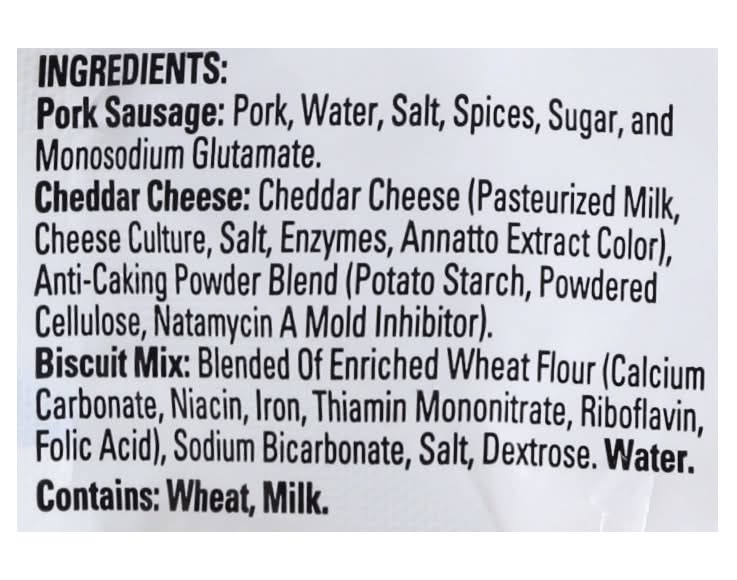 Ingredients: Pork Sausage: Pork, Water, Salt, Spices, Sugar, and Monosodium Glutamate. Cheddar Cheese: Cheddar Cheese (Pasteurized Milk, Cheese Culture, Salt, Enzymes, Annatto Extract Color), Anti-Caking Powder Blend (Potato Starch, Powdered Cellulose, Natamycin a Mold Inhibitor). Biscuit Mix: Blended of Enriched Wheat Flour (Calcium Carbonate, Niacin, Iron, Thiamin Mononitrate, Riboflavin, Folic Acid), Sodium Bicarbonate, Salt, Dextrose, Water Contains: Wheat, Milk