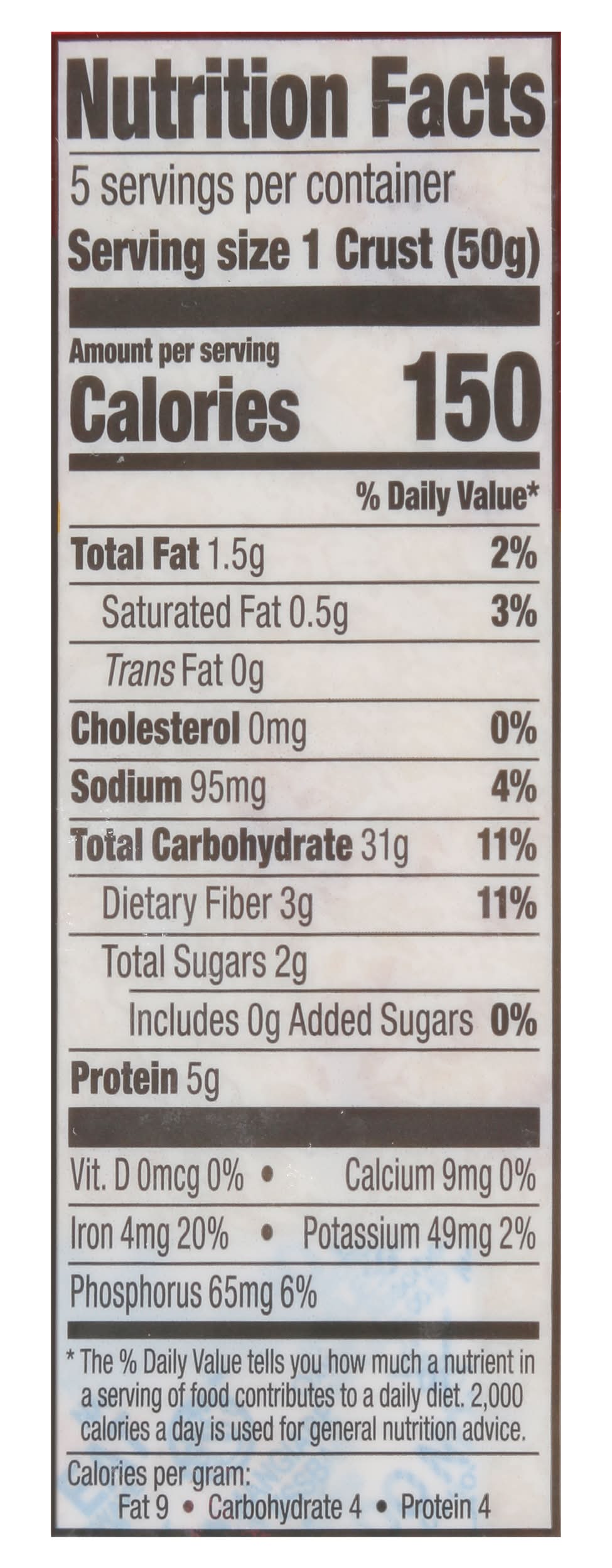 Directions for use: Baking Instructions: Oven: (1) Preheat oven to 425 degrees F. (2) Remove one ultra thin pizza crust from the package. (3) Top with your favorite pizza sauce & toppings. (4) Bake 8-12 min. directly on center oven rack. (5) Cool 1-2 min on a wire rack to retain maximum crispiness. Gas Grill: (1) Preheat grill for 10-15 min. (2) Remove one ultra thin pizza crust from the package & assemble the pizza. (3) Turn grill to lowest setting or off. (4) Put the pizza on the rack & close lid. (5) Bake time 8-10 min check occasionally. Remove and discard the freshness pack. Make your own fun-sized masterpiece! Great for kids, snacks, parties and the grill! The fun starts here, try - pizza sauce, bbq sauce, olive oil, pesto sauce, cheese, pepperoni, sausage, bacon, pineapple mushrooms, green peppers, olives, shrimps, onions, garlic, or oregano. Once opened, unused crust may be stored refrigerated for 3-5 days in resealed package or in your freezer for up to 30 days. Lift & pull apart. Press to reseal. Storage recommendation: stored refrigerated for 3-5 days in resealed package or in your freezer for up to 30 days.