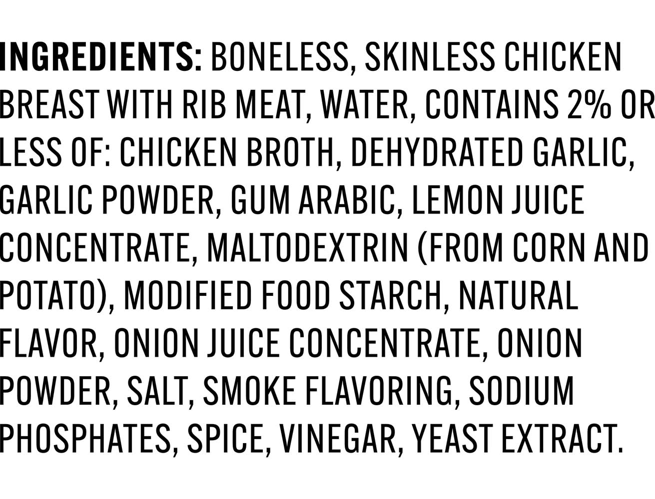 Ingredients: Boneless, Skinless Chicken Breast With Rib Meat, Water, Contains 2% or Less of: Chicken Broth, Dehydrated Garlic, Garlic Powder, Gum Arabic, Lemon Juice Concentrate, Maltodextrin (From Corn and Potato), Modified Food Starch, Natural Flavor, Onion Juice Concentrate, Onion Powder, Salt, Smoke Flavoring, Sodium Phosphates, Spice, Vinegar, Yeast Extract.