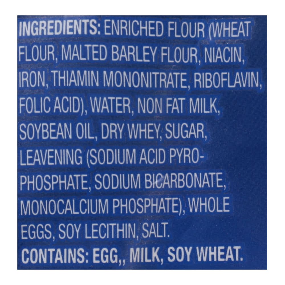 Ingredients: Enriched Flour (Wheat Flour, Malted Barley Flour, Niacin, Iron, Thiamin Mononitrate, Riboflavin, Folic Acid), Water, Non Fat Milk, Soybean Oil, Dry Whey, Sugar, Leavening (Sodium Acid Pyrophosphate, Sodium Bicarbonate, Monocalcium Phosphate), Whole Eggs, Soy Lecithin, Salt Contains: Eggs, Milk, Soybeans, Wheat, Barley