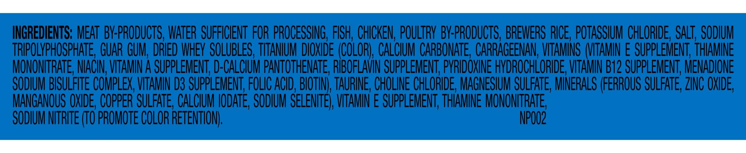 Ingredients: Water Sufficient For Processing, Meat-by-products, Chicken, Fish, Liver, Brewers Rice, Potassium Chloride, Salt, Sodium Tripolyphosphate, Guar Gum, Dried Whey Solubles, Titanium Dioxide (color), Shrimp, Crab, Carrageenan, Vitamins (vitamin E Supplement, Thiamine Mononitrate, Niacin, Vitamin A Supplement, D-calcium Pantothenate, Riboflavin Supplement, Pyridoxine Hydrochloride, Vitamin B12 Supplement, Menadione Sodium Bisulfite Complex, Vitamin D3 Supplement, Folic Acid, Biotin), Taurine, Choline Chloride, Minerals (ferrous Sulfate, Zinc Oxide, Manganous Oxide, Copper Sulfate, Calcium Iodate, Sodium Selenite), Vitamin E Supplement, Thiamine Mononitrate, Sodium Nitrite (to Promote Color Retention)