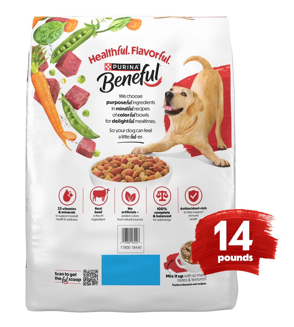 Serve your dog a bowlful of delicious goodness with Purina Beneful Originals With Farm-Raised Beef Natural Dry Dog Food Recipe With Vitamins, Minerals and Nutrients. With real beef as the number 1 ingredient and accents of real spinach, dried peas and carrots, this Purina Beneful dry dog food provides wholesome ingredients you can feel good about serving. This natural dog kibble gives him 23 essential vitamins for dogs and minerals in each serving to support his overall health and wellness. With 23 grams of high-quality protein to support strong muscles and antioxidants for immune support, this premium dog food combines the nutrients your dog needs with the flavors he loves. You care what goes into your dog's food, which is why Purina Beneful Originals with beef dog food kibble contains no artificial preservatives, flavors and added colors only from natural sources. Show your faithful dog he’s your number 1 with Purina Beneful dog food. Healthful. Flavorful. Beneful.