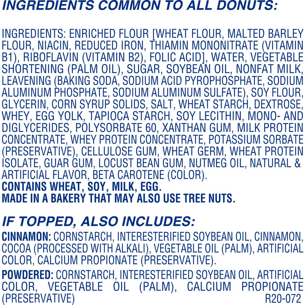 Ingredients: Soybean Oil, Tapioca Starch, Soy Lecithin, Mono- and Diglycerides, Polysorbate 60, Xanthan Gum, Milk Protein Concentrate, Whey Protein Concentrate, Potassium Sorbate Preservative, Cellulose Gum, Wheat Germ, Wheat Protein Isolate, Guar Gum, Locust Bean Gum, Nutmeg Oil, Natural & Artificial Flavor, Beta Carotene Color. If Topped, Interesterified Soybean Oil, Cinnamon, Cocoa Processed with Alkali, Vegetable Oil Palm, Artificial Color, Interesterified Soybean Oil, Artificial Color, Vegetable Oil Palm, Soybean Oil, Tapioca Starch, Soy Lecithin, Mono- and Diglycerides, Polysorbate 60, Xanthan Gum, Milk Protein Concentrate, Whey Protein Concentrate, Potassium Sorbate Preservative, Cellulose Gum, Wheat Germ, Wheat Protein Isolate, Guar Gum, Locust Bean Gum, Nutmeg Oil, Natural & Artificial Flavor, Beta Carotene Color. If Topped, Interesterified Soybean Oil, Cinnamon, Cocoa Processed with Alkali, Vegetable Oil Palm, Artificial Color, Interesterified Soybean Oil, Artificial Color, Vegetable Oil Palm, Soybean Oil, Tapioca Starch, Soy Lecithin, Mono- and Diglycerides, Polysorbate 60, Xanthan Gum, Milk Protein Concentrate, Whey Protein Concentrate, Potassium Sorbate Preservative, Cellulose Gum, Wheat Germ, Wheat Protein Isolate, Guar Gum, Locust Bean Gum, Nutmeg Oil, Natural & Artificial Flavor, Beta Carotene Color. If Topped, Interesterified Soybean Oil, Cinnamon, Cocoa Processed with Alkali, Vegetable Oil Palm, Artificial Color, Interesterified Soybean Oil, Artificial Color, Vegetable Oil Palm, Calcium Propionate Preservative., Cinnamon: Cornstarch, Folic Acid, Sodium Acid Pyrophosphate, Niacin, Reduced Iron, Thiamin Mononitrate Vitamin B1, Water, Malted Barley Flour, Riboflavin Vitamin B2, Vegetable Shortening Palm Oil, Sugar, Nonfat Milk, Leavening Baking Soda, Sodium Aluminum Phosphate, Sodium Aluminum Sulfate, Soy Flour, Glycerin, Corn Syrup Solids, Salt, Wheat Starch, Dextrose, Whey, Egg Yolk Contains: Wheat, Soybeans, Milk, Eggs, Barley, Corn, Tree Nuts