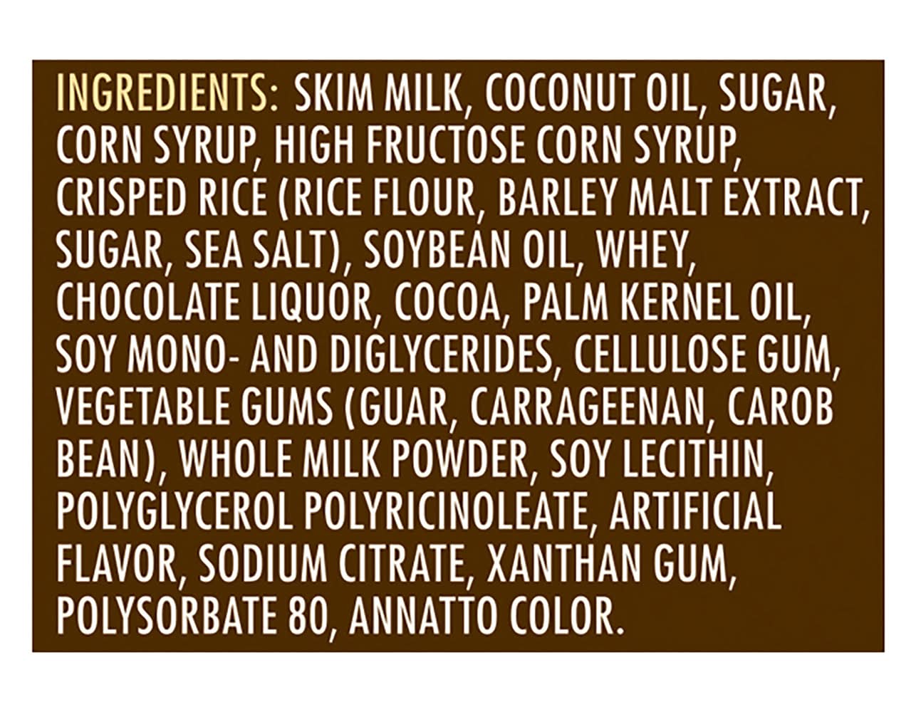 Ingredients: Skim Milk, Coconut Oil, Sugar, Corn Syrup, High Fructose Corn Syrup, Crisped Rice (Rice Flour, Barley Malt Extract, Sugar, Sea Salt), Soybean Oil, Whey, Chocolate Liquor, Cocoa, Palm Kernel Oil, Soy Mono- and Diglycerides, Cellulose Gum, Vegetable Gums (Guar, Carrageenan, Carob Bean), Whole Milk Powder, Soy Lecithin, Polyglycerol Polyricinoleate, Artificial Flavor, Sodium Citrate, Xanthan Gum, Polysorbate 80, Annatto Color Contains: Milk, Barley, Soybeans