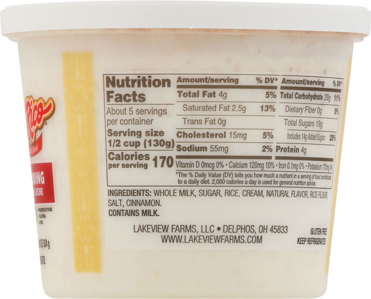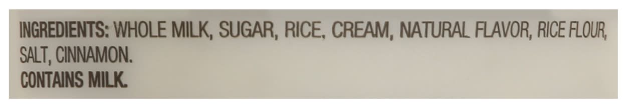 Ingredients: Whole Milk, Sugar, Rice, Cream, Natural Flavor, Rice Flour, Salt, Cinnamon Contains: Milk