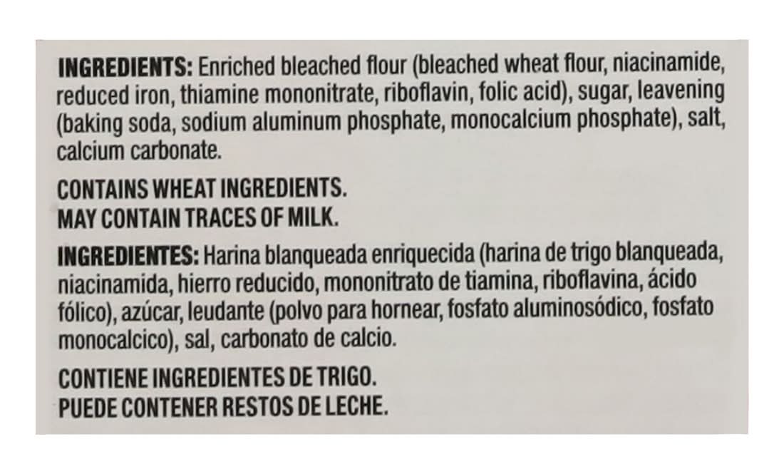 Ingredients: Enriched Bleached Flour (Bleached Wheat Flour Niacinamide Reduced Iron Thiamine Mononitrate Riboflavin Folic Acid), Sugar, Leavening (Baking Soda Sodium Aluminum Phosphate Monocalcium Phosphate), Salt, Calcium Carbonate Contains: Wheat, Milk