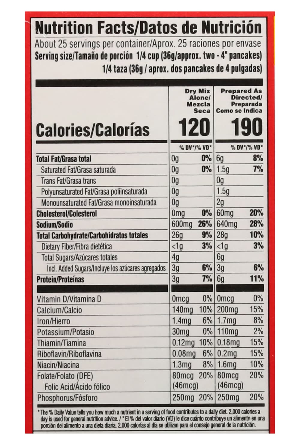 Safe handling instructions: pancake mix is made with raw flour so it is not ready-to-eat and must be thoroughly cooked before eating to prevent illness from bacteria in the flour. do not eat or play with raw dough; wash hands, utensils, and surfaces after handling. makes 8 four-inch pancakes: 1 cup dry mix, 3/4 cup milk, 1 tbsp oil, 1 egg. (1) heat skillet over medium-low heat or electric griddle to 375 degrees f. (2) combine all ingredients and stir until large lumps disappear (do not beat or over-mix). let stand 1-2 minutes to thicken. (3) pour slightly less than 1/4 cup batter for each pancake onto lightly greased skillet. tip: for golden brown pancakes, use solid shortening instead of oil, butter, or margarine. (4) cook for 90 seconds on first side. turn, and cook for another 60 seconds. tip: for soft end fluffy pa cakes, avoid turning thorn more than once. single serving directions(two 4-inch pancakes): use 1/4 cup mix, 3 tbsp milk, 1 egg white, 1/2 tsp oil. to open lift tab and pull. tuck in to close.
