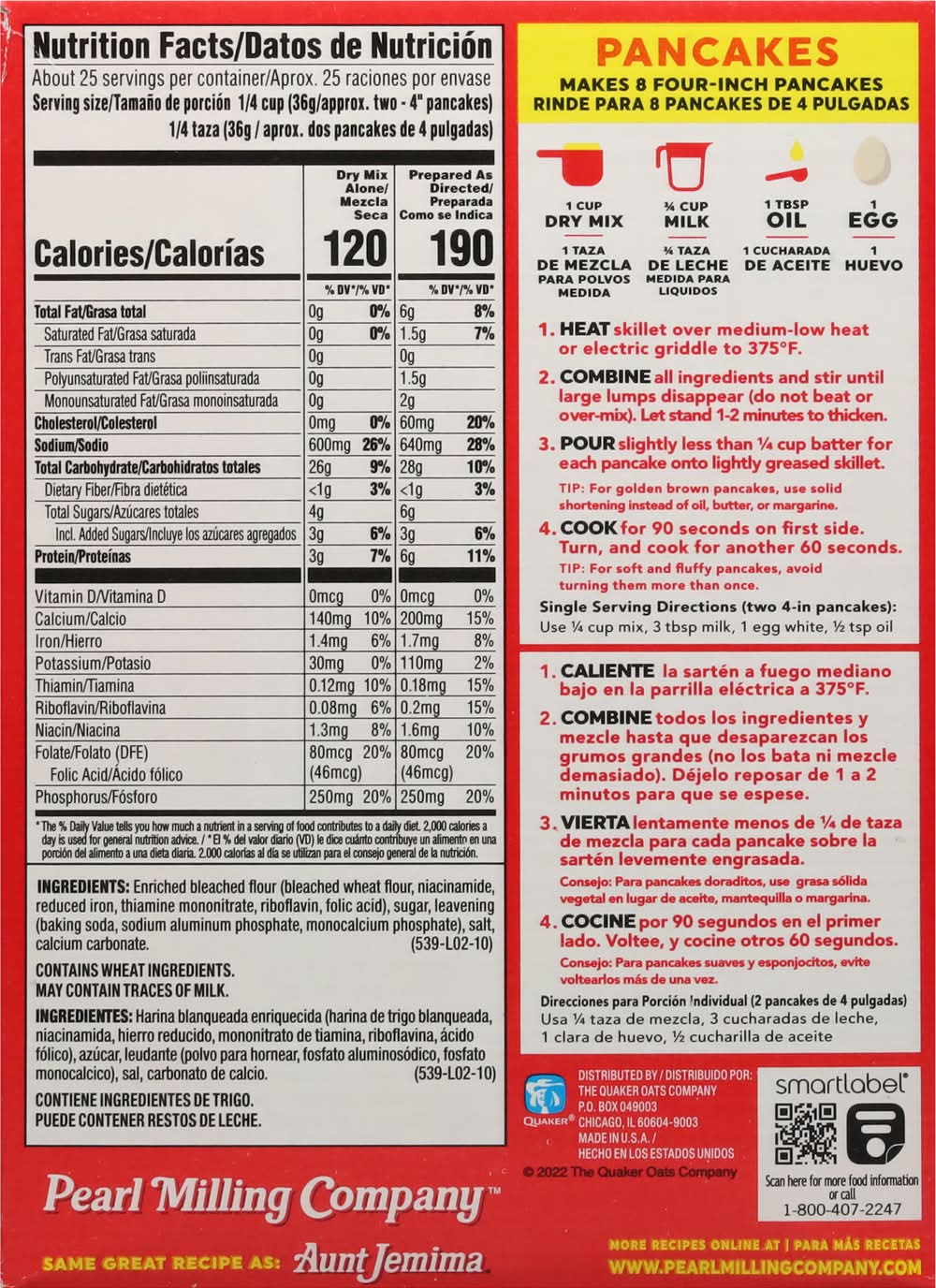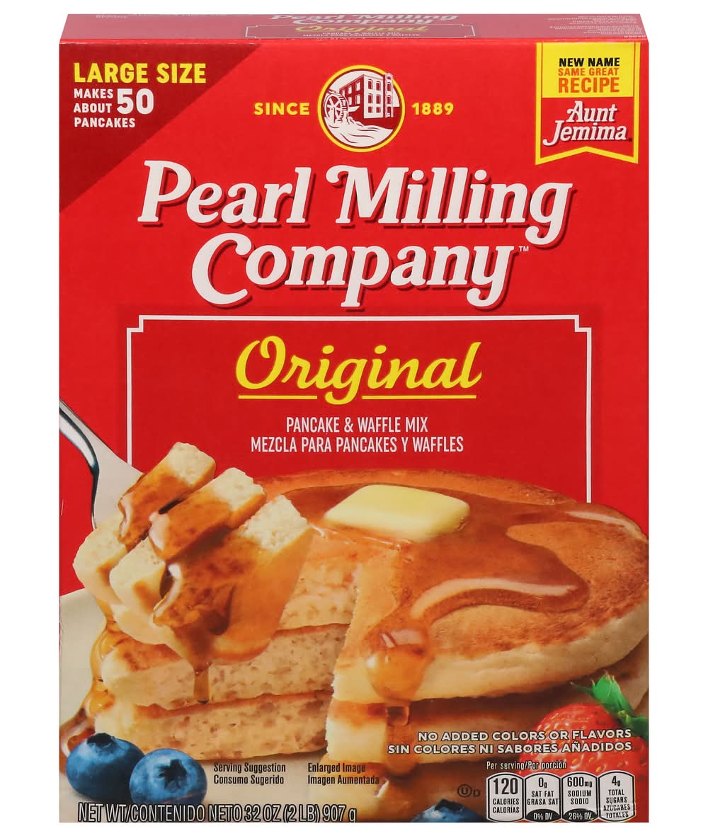 Large size makes 50 about pancakes. Since 1889. New name same great taste. Aunt Jemima. Same Great Taste: Aunt Jemima. Start of a new day. Back in 1889, our famous pancake recipe was first produced at a small mill in St. Joseph. Missouri Pearl Milling Company. Since then, helping families start the day with a delicious breakfast option has been the mission of our pancakes. And while our name has changed, the light and fluffy pancakes and great tasting syrups you love remain the same. Here's to creating more memories and sharing more smiles for generations to come. With love, Pearl Milling Company. Stack up the moments. Hi there, we're Pearl Milling Company. We want to thank you for choosing our light and fluffy textured pancake mix and hope you'll enjoy every bite. Our recipe has been perfected for over 130 years, but our commitment will always be the same: To bring families to the table to stack up the delicious moments. • The Quaker Oats Company, Po Box 049003, Chicago, IL • Packaging: Reusable