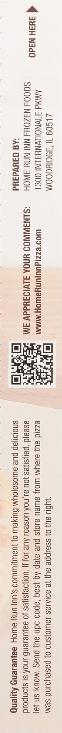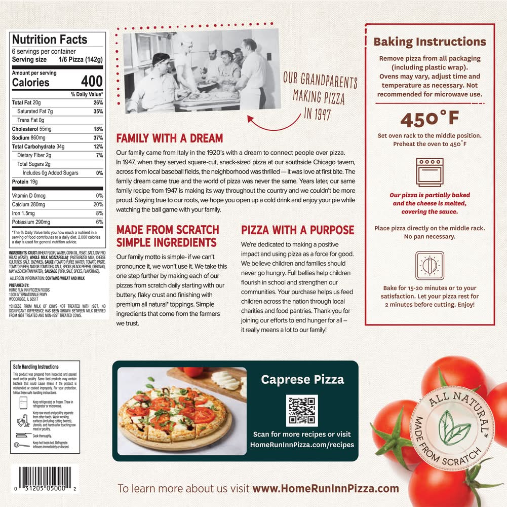 All natural (minimally processed, no artificial ingredients). Made from scratch. Cook thoroughly. Our grandparents making pizza in 1974. Family with a Dream: Our family came from Italy in the 1920's with a dream to connect people over pizza. In 1947, when they served square-cut, snack-sized pizza at our southside Chicago tavern, across from local baseball fields, the neighborhood was thrilled - it was love at first bite. The family dream came true and the world of pizza was never the same. Years later, our same family recipe from 1947 is making its way throughout the country and we couldn't be more proud. Staying true to our roots, we hope you open up a cold rink and enjoy your pie while watching the ball game with your family. Made from scratch simple ingredients: Our family motto is simple - if we can't pronounce it, we won't use it. We take this one step further by making each of our pizzas from scratch daily starting with our buttery, flaky crust and finishing with premium all natural (minimally processed, no artificial ingredients) toppings. Simple ingredients that come from the farmers we trust. Pizza with a purpose: We're dedicated to making a positive impact and using pizza as a force for good. We believe children and families should never go hungry. Full bellies help children flourish in school and strengthen our communities. Each year you help us feed over a million children across the nation through local charities and food pantries. Thank you for joining our efforts to end hunger for all - it really means a lot to our family! Quality Guarantee: Home Run Inn's commitment to making wholesome and delicious products is your guarantee of satisfaction. If for any reason you're not satisfied, please let us know. Send the UPC code, best by date and store name from where the pizza was purchased to customer service at the address on the box. U.S. Inspected and passed by Department of Agriculture. Please recycle this box.