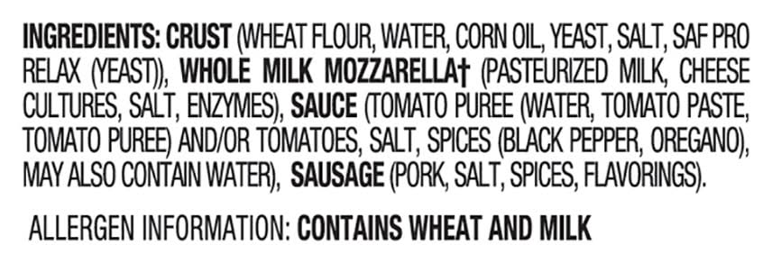 Ingredients: Crust (Wheat Flour, Water, Corn Oil, Yeast, Salt, Saf Pro Relax (Yeast)), Whole Milk Mozzarella(a) (Pasteurized Milk, Cheese Cultures, Salt, Enzymes), Sauce (Tomato Puree (Water, Tomato Paste, Tomato Puree) and/or Tomatoes, Salt, Spices (Black Pepper, Oregano), May Also Contain Water), Sausage (Pork, Salt, Spices, Flavorings). (a) Cheese from Milk of Cows Not Treated with rBST, No Significant Difference Has Been Shown Between Milk Derived from rBST Treated and Non-rBST Treated Cows Contains: Wheat, Milk