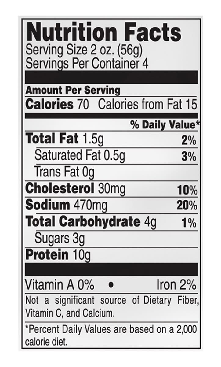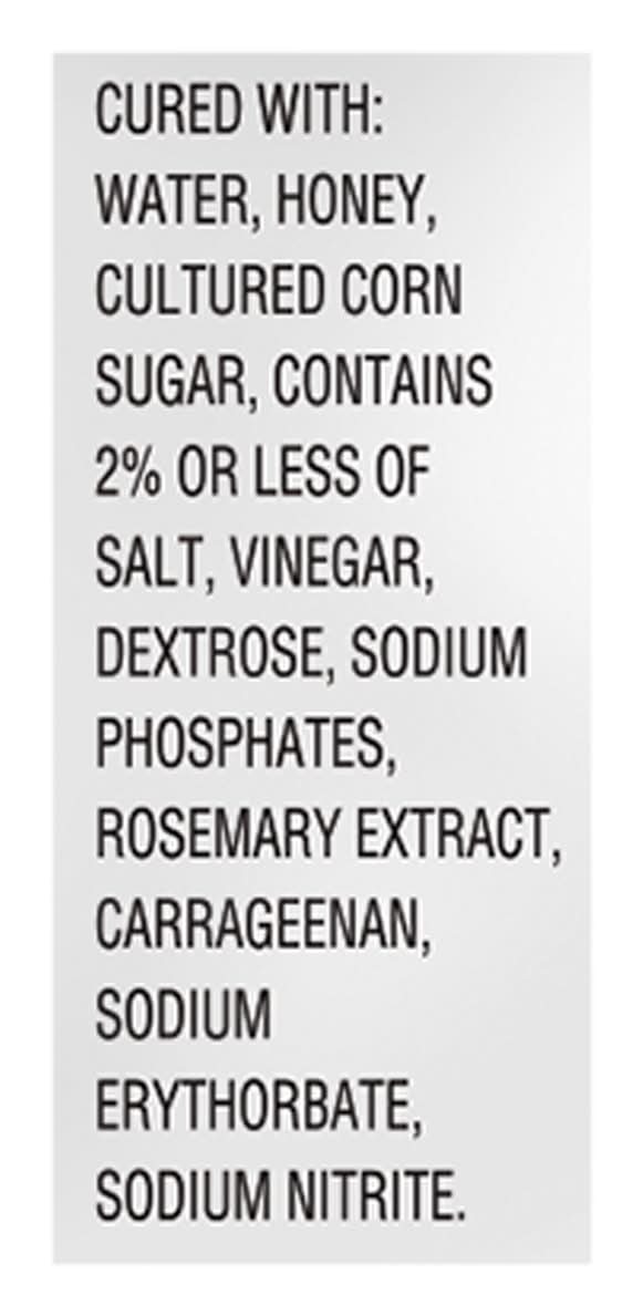 Ingredients: Cured with: Water, Honey, Cultured Corn Sugar, Contains 2% or Less of Salt, Vinegar, Dextrose, Sodium Phosphates, Rosemary Extract, Carrageenan, Sodium Erythorbate, Sodium Nitrite Contains: Corn
