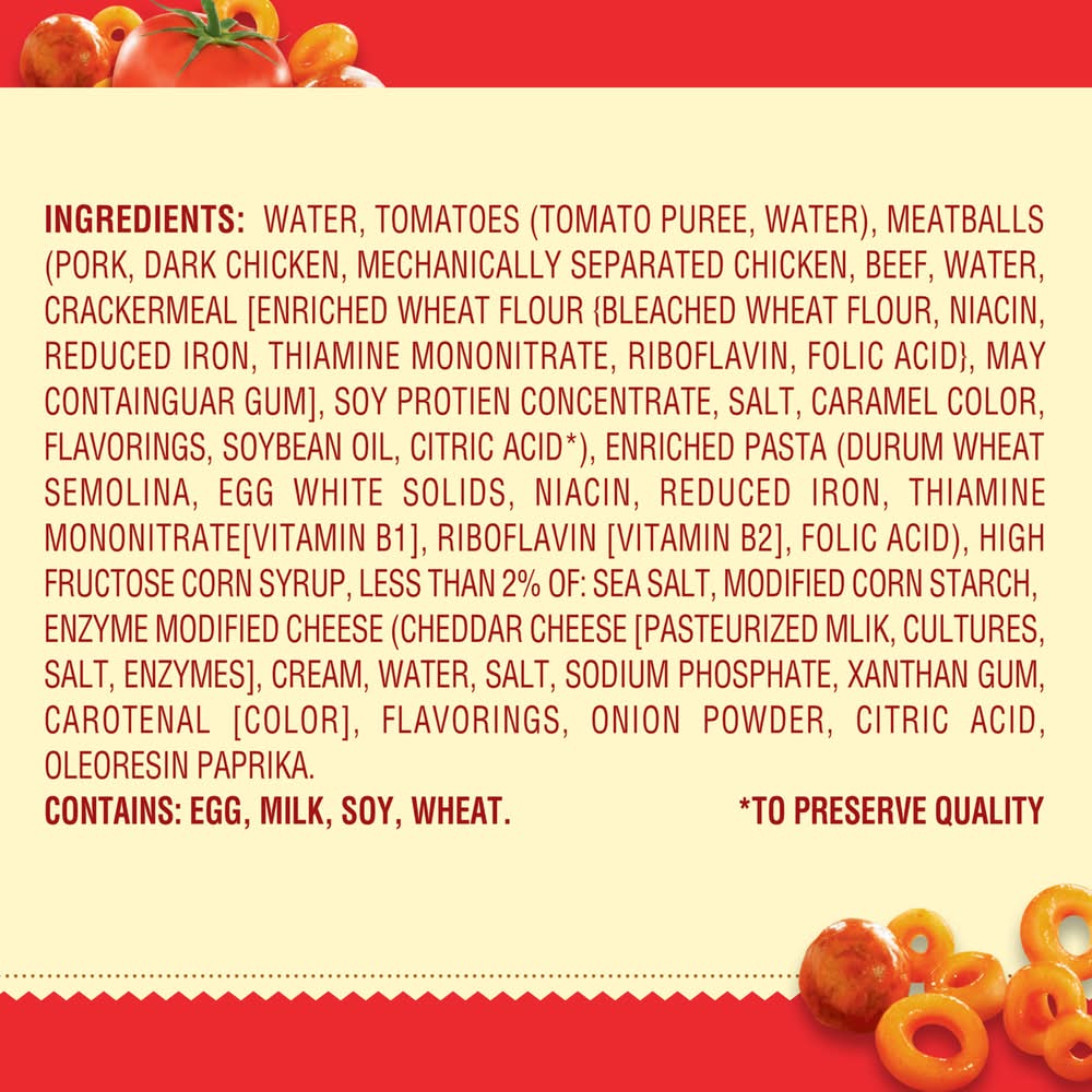 Ingredients: Water, Tomatoes (Tomato Puree, Water), Meatballs (Pork, Chicken, Mechanically Separated Chicken, Beef, Water, Crackermeal [Enriched Wheat Flour {Bleached Wheat Flour, Niacin, Reduced Iron, Thiamine Mononitrate, Riboflavin, Folic Acid}, May Contain Guar Gum], Soy Protein Concentrate, Salt, Caramel Color, Flavorings, Soybean Oil, Citric Acid), Enriched Pasta (Durum Wheat Semolina, Egg White, Niacin, Reduced Iron, Thiamine Mononitrate [Vitamin B1], Riboflavin [Vitamin B2], Folic Acid), High Fructose Corn Syrup, LESS THAN 2% OF: Potassium Chloride, Modified Corn Starch, Sea Salt, Enzyme Modified Cheese (Cheddar Cheese [Pasteurized Milk, Cultures, Salt, Enzymes], Cream, Water, Salt, Sodium Phosphate, Xanthan Gum, Carotenal [Color]), Flavorings, Citric Acid, Extractives of Paprika. CONTAINS: EGG, MILK, SOY, WHEAT Contains: Egg, Milk, Soy, Wheat